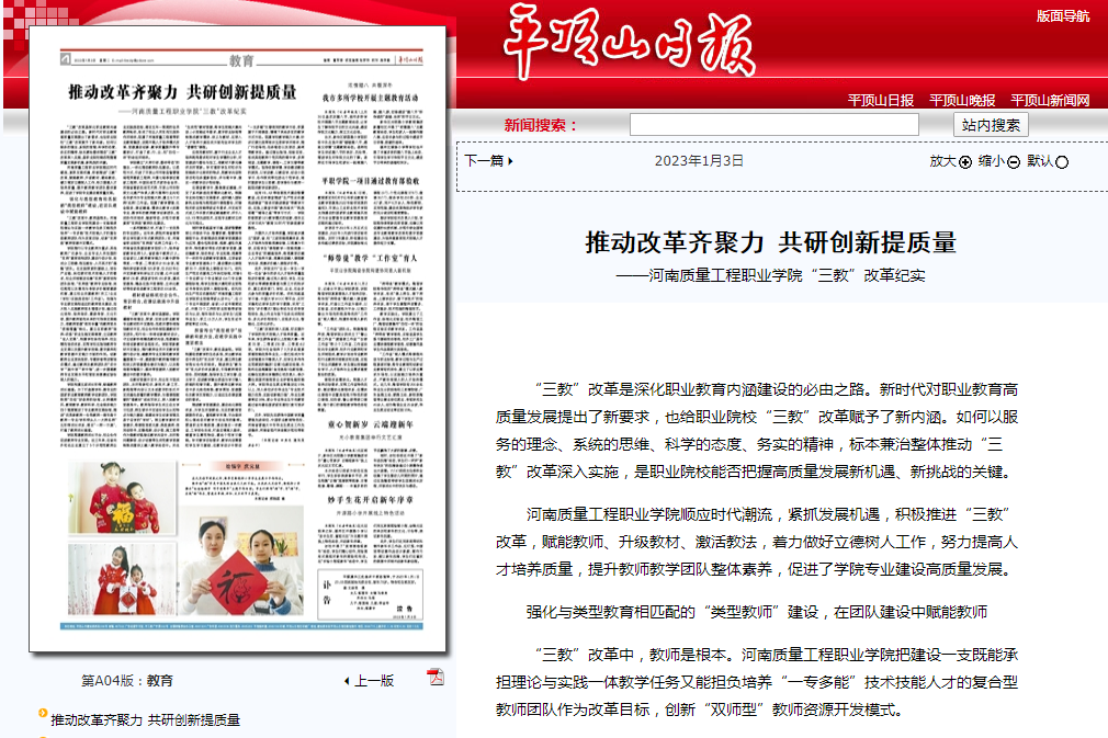 2023年1月3日,《平顶山日报》第A04版对我院“三教”改革情况进行了专题报道。