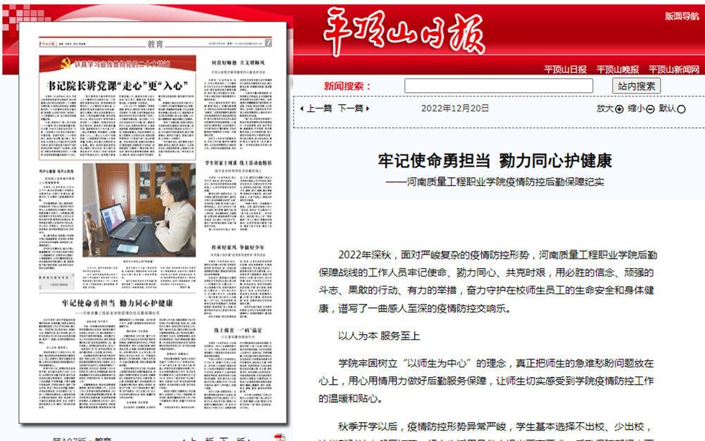 2022年12月20日,《平顶山日报》第A07版对我院疫情防控后勤保障工作进行了专题报道。