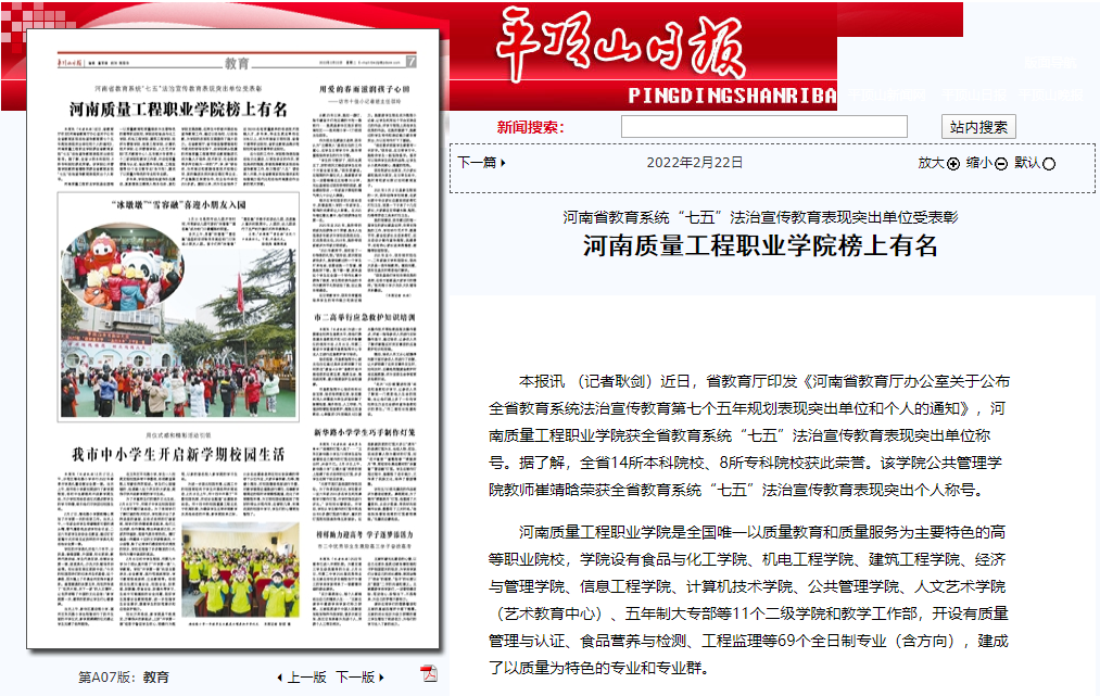多年来,学院加强法治宣传队伍建设,紧紧围绕立德树人根本任务,紧扣学院发展战略,在师生中积极开展法治宣传教育工作,通过以法治校、以法治教,为学院的改革和发展提供了强大动力。在省教育厅、省市场监督管理局和市政府的领导支持下,由学院牵头组建的河南质量工程高等职业教育集团已成为集人才培养、技术研发、社会服务等多种功能为一体的“产、学、研”联合体,与河南云和数据信息技术有限公司、美的集团及郑州航空港区等企业、产业集聚区深度合作,校企合作单位200多家。建院以来,共为社会培养了近36000名有质量素养的各类技术技能人才,多年来,毕业生就业率均在90%以上,成为河南省文明校园、省骨干高等职业院校、省职业教育品牌示范院校和省优质高等职业院校。