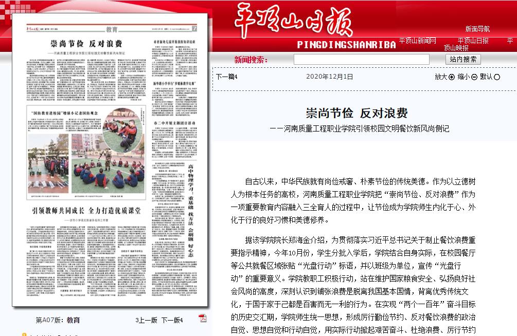 据该学院院长郑海金介绍,为贯彻落实习近平总书记关于制止餐饮浪费重要指示精神,今年10月份,学生分批入学后,学院结合自身实际,在校园餐厅等公共就餐区域张贴“光盘行动”标语,并以班级为单位,宣传“光盘行动”的重要意义。学院教职工积极行动,站在维护国家粮食安全、弘扬良好社会风尚的高度,深刻认识到铺张浪费是脱离我国基本国情,背离优秀传统文化,于国于家于己都是百害而无一利的行为。在实现“两个一百年”奋斗目标的历史交汇期,学院师生统一思想,形成厉行勤俭节约、反对餐饮浪费的政治自觉、思想自觉和行动自觉,用实际行动掀起艰苦奋斗、杜绝浪费、厉行节约的热潮。