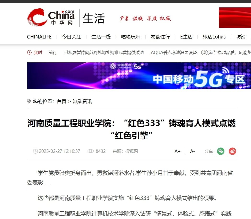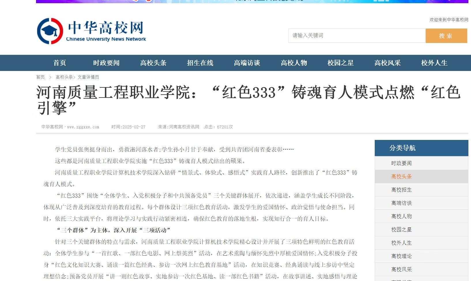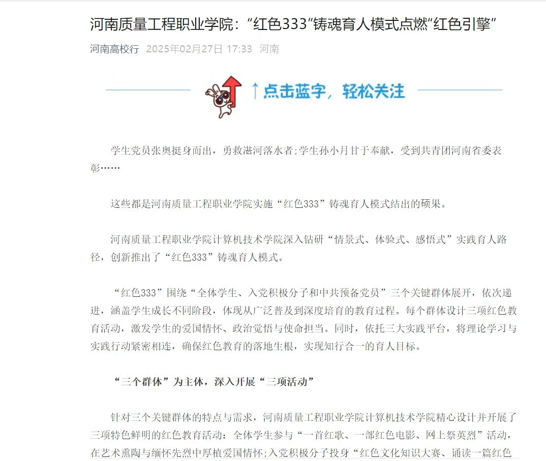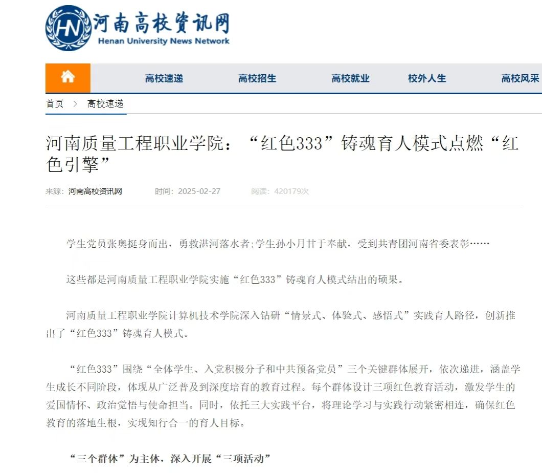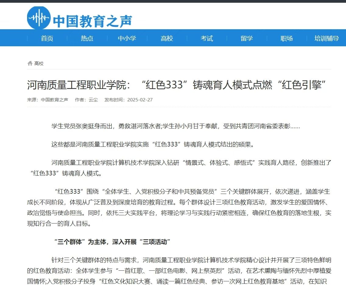2月27日,《平顶山日报》、中国教育之声、中华网、中华高校网、河南高校资讯网、河南高校行等媒体平台对我院计算机技术学院创新实施“红色333”铸魂育人模式,推动学生思想政治教育取得丰硕成果的情况进行了专题报道。