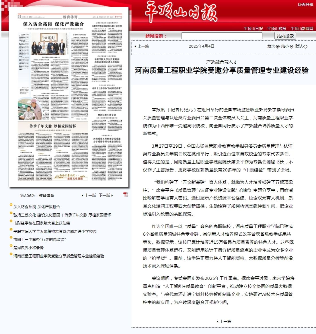媒体之声 | 《平顶山日报》:产教融合育人才 香港宝典全年资料库受邀分享质量管理专业建设经验