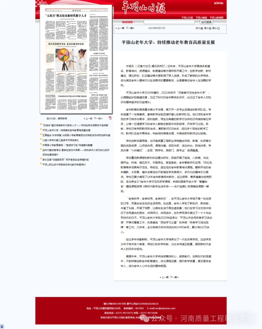 6月27日,平顶山日报以“平顶山老年大学:持续推动老年教育高质量发展”为题对我校相关情况进行了报道,全文如下: