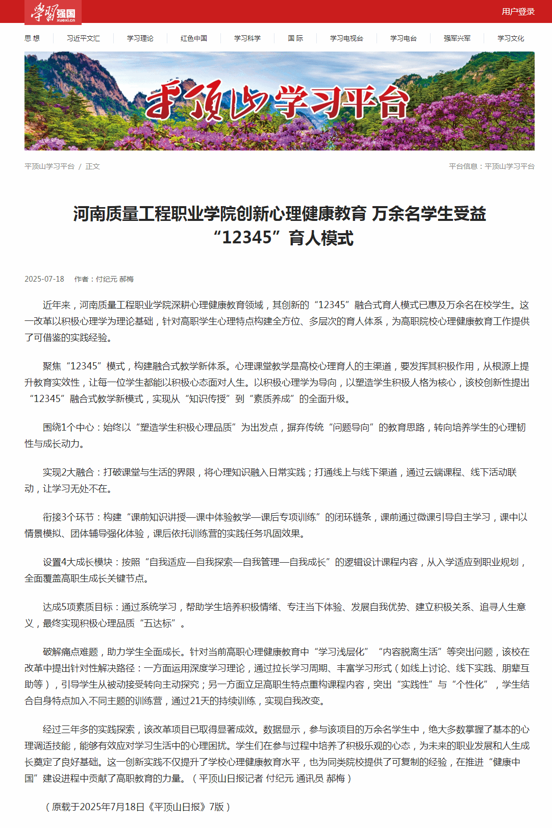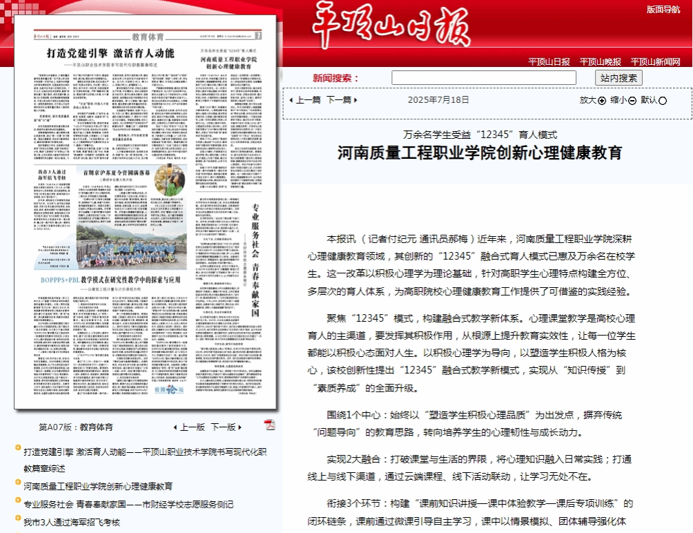 7月18日,学习强国平台、《平顶山日报》对我校心理健康教育“12345”育人模式进行了报道,全文如下: