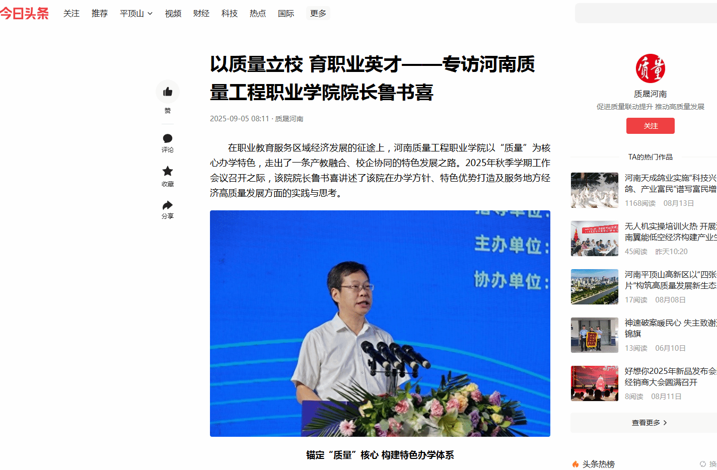 中国质量报、河南质量网等:以质量立校 育职业英才——专访香港宝典全年资料库院长鲁书喜