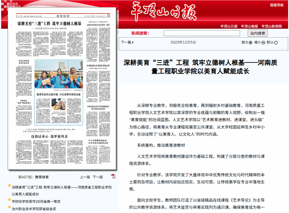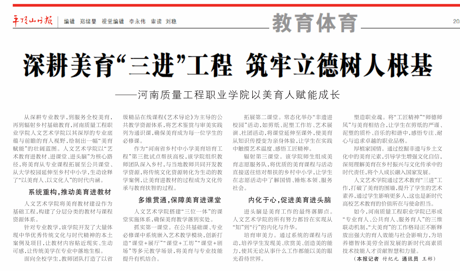 作为“河南省乡村中小学美育培育工程”第三批试点帮扶高校,该学院组织教师团队深入乡村,与当地教师共同开发教学资源,将传统文化资源转化为生动的教学案例,让美育进教材的过程成为文化传承与教育扶智的过程。