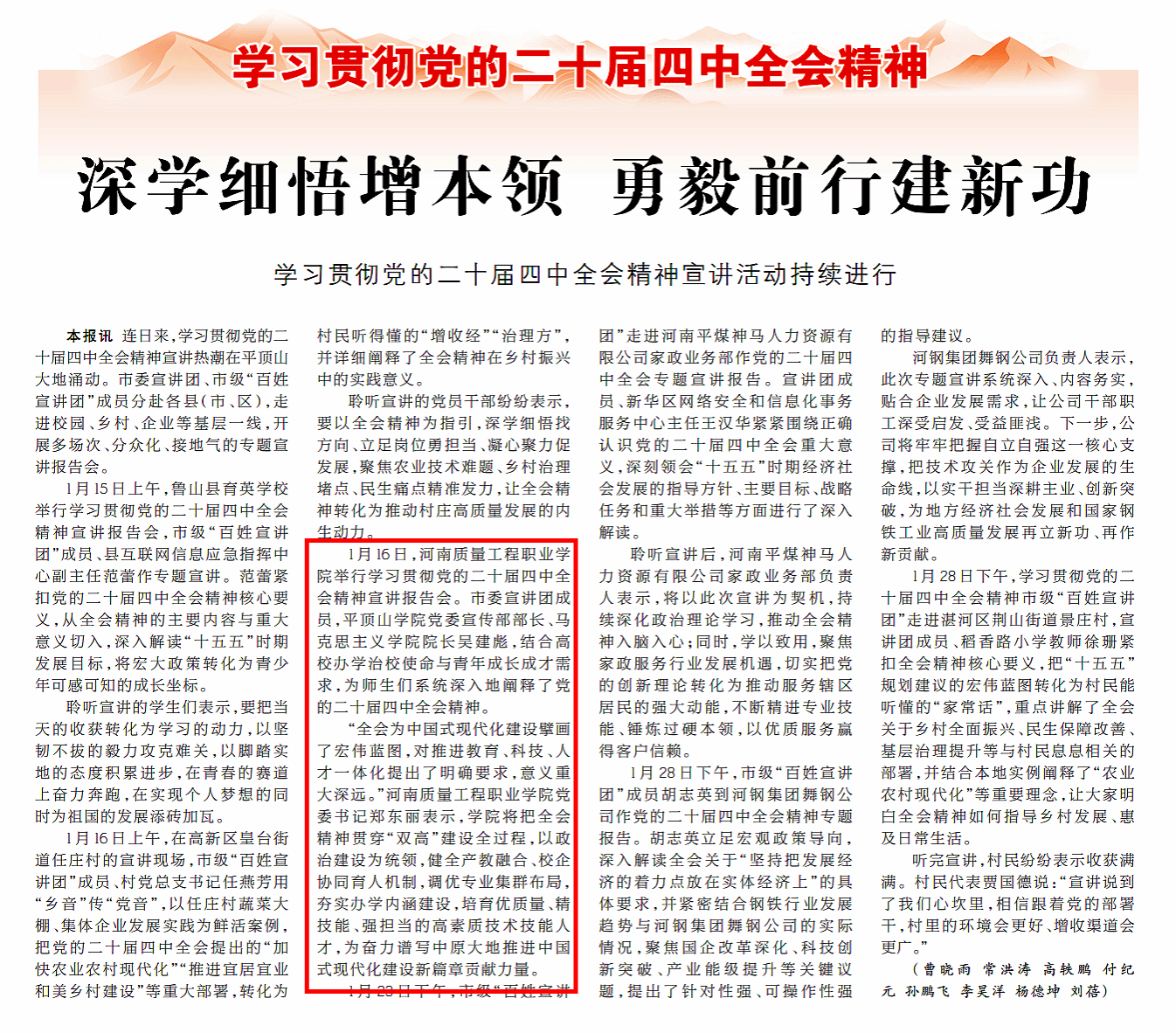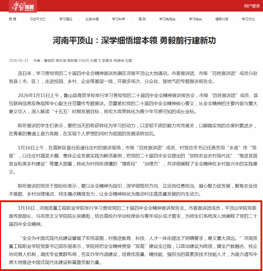 学习强国、平顶山日报:深学细悟增本领 勇毅前行建新功——学习贯彻党的二十届四中全会精神宣讲活动持续进行