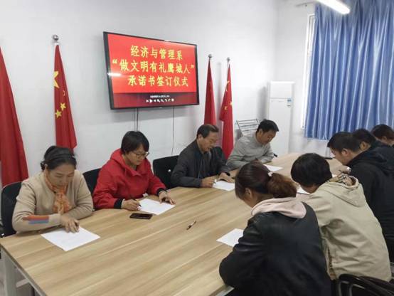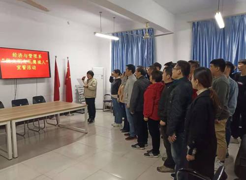 10月16日上午,经济与管理系教职工和部分学生代表响应市委、市政府号召,在系二楼会议室开展“做文明有礼鹰城人”宣誓活动。