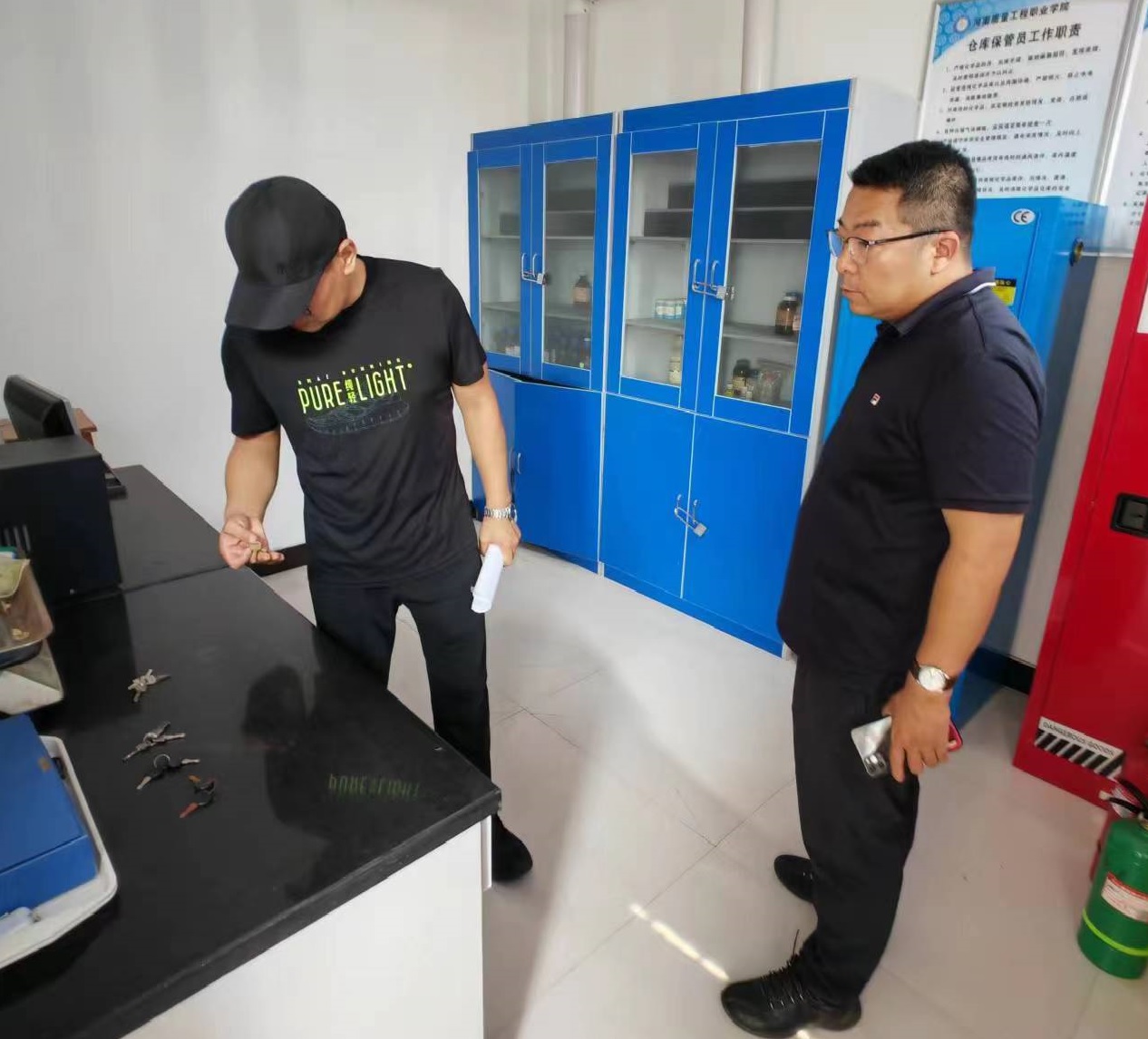 检查组重点检查了各实验实训室在安全制度建设、危险化学品及危废处置管理、压力容器的使用与管理、设备运行安全、水电安全、消防安全管理等方面的情况。