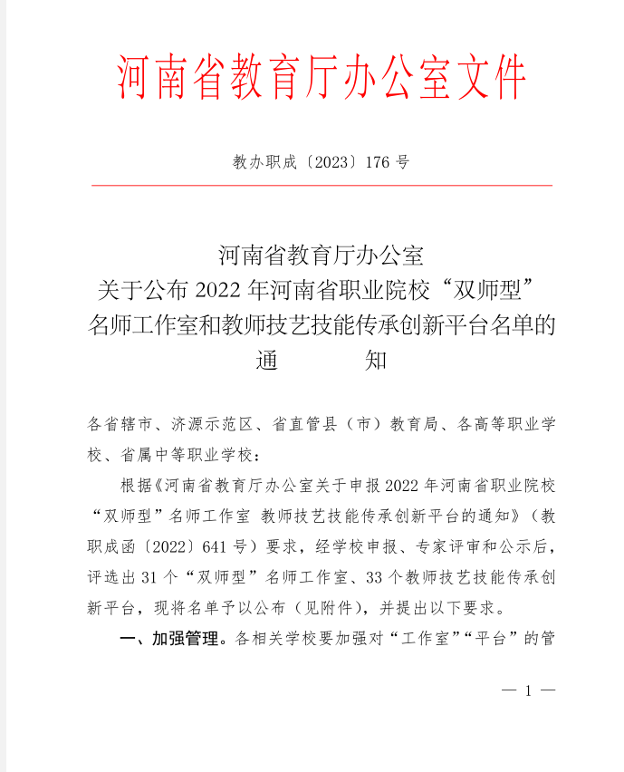 近日,河南省教育厅发布了《关于公布2022年河南省职业院校“双师型”名师工作室和教师技艺技能传承创新平台名单的通知》(教办职成〔2023〕176号),我院教师席会平主持的食品检验检测技术专业“双师型”名师工作室获批立项。