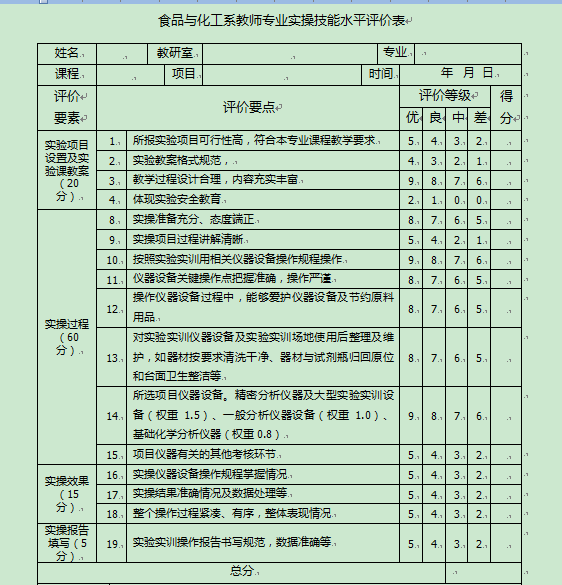 根据国务院《关于加快发展现代职业教育的决定》及教育部《关于深化职业教育教学改革全面提高人才培养质量的若干意见》(教职成2015-6号)等文件的规定可以看出,高职院校教师的专业技能是高职教育培养目标的重要组成部分,是促进高职院校教学质量提高、培养高级技术技能人才的重要支撑。为了满足新时期我院各项教育教学目标实现和工作要求,食品与化工系研究决定对本系专任教师进行专业技能考核,具体安排如下: