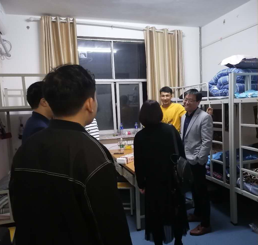 10月11日晚上,食品与化工学院院长张虽栓、党总支书记胡洁涛、副院长张德广、王霞、党总支副书记李姗姗、学生科科长刘书红及辅导员来到学生宿舍,探望2020级入学新生。