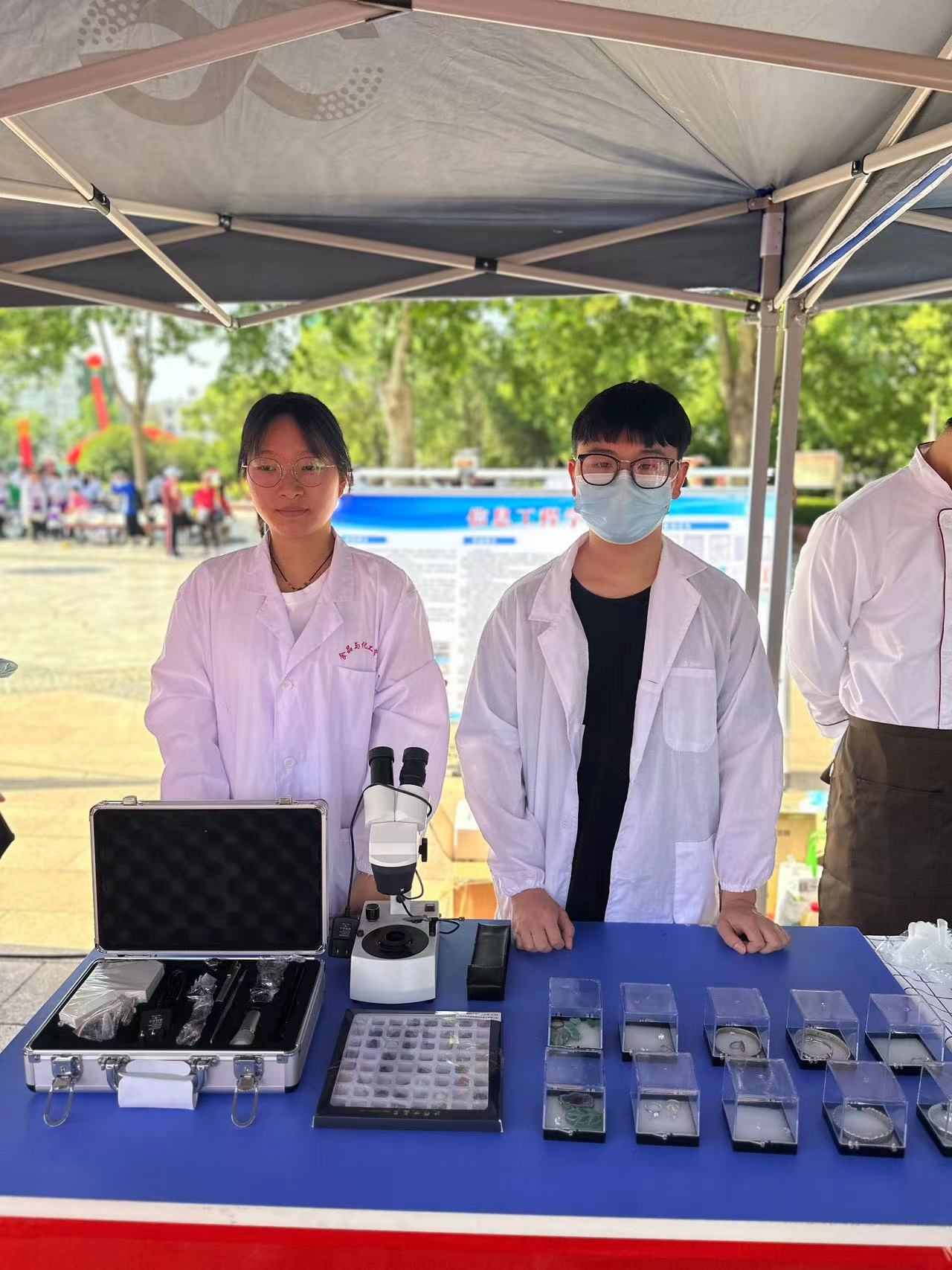 在此次职业教育活动周启动仪式现场,我院共有3个项目展示,一是烘焙产品以及葡萄酒、果酒等产品展示及分享,展示我院食品类专业先进的加工工艺以及学生扎实的技术技能;二是营养咨询与健康教育,主要是中国居民膳食宝塔及膳食指南推荐宣传、营养咨询以及个人体质的判断等内容,展示我院健康类专业学生专业的营养指导技能和服务能力;三是珠宝玉石鉴定评价,对常见玉石进行加工和鉴定,展示我院宝玉石专业独特的特色以及学生的专业技能。