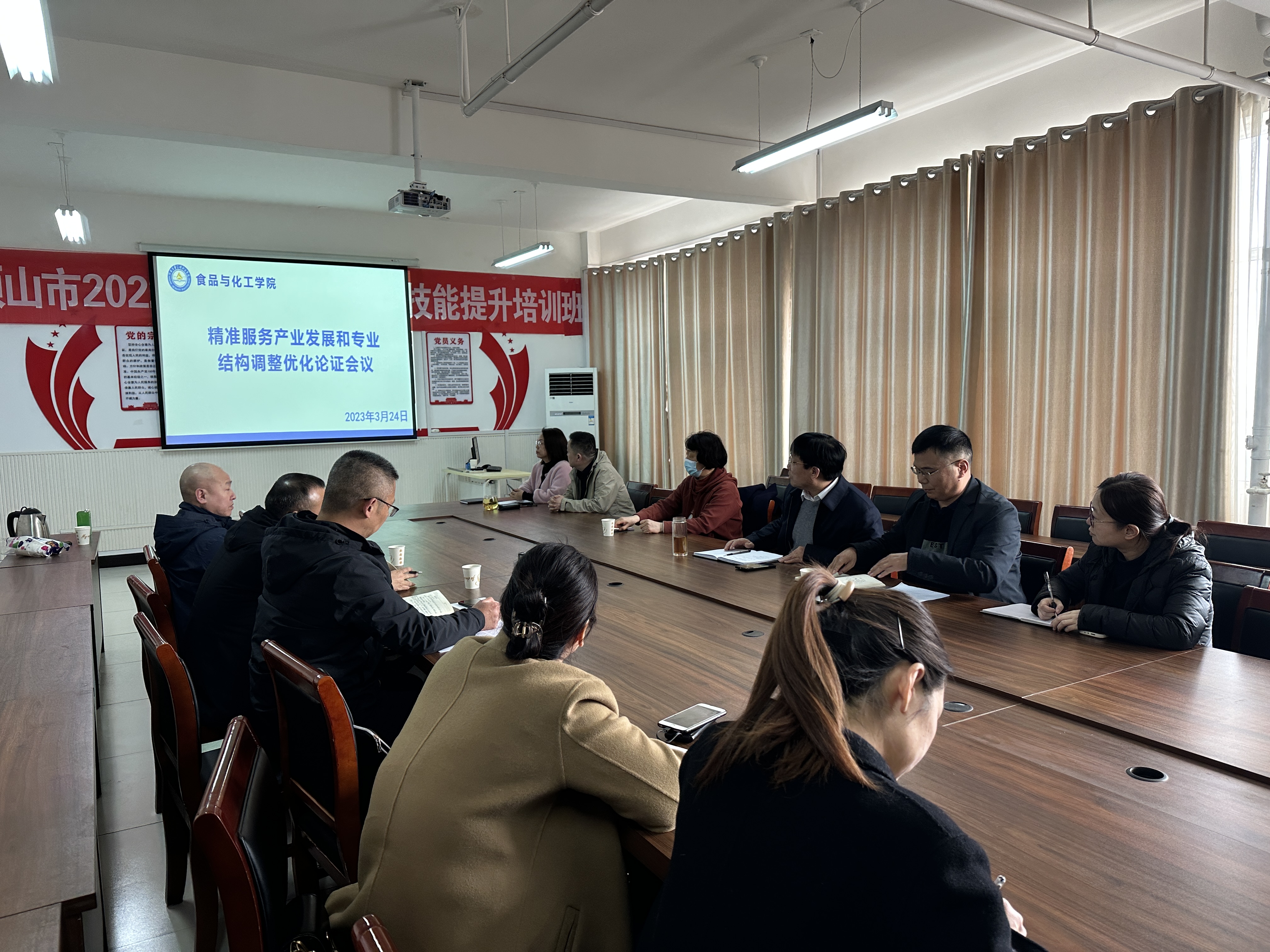 3月24日下午,食品与化工学院在食检大楼5楼会议室召开了精准服务产业发展和专业结构调整优化论证会,平顶山市农业局、畜牧局、神马集团尼龙科技公司、平顶山凯美威有限公司等行业企业专家、学院科研处蔡花真处长、食检中心马勇主任以及食品与化工学院领导班子、教研室主任、教学秘书等参加了会议。会议由食化学院院长张虽栓院长主持。
