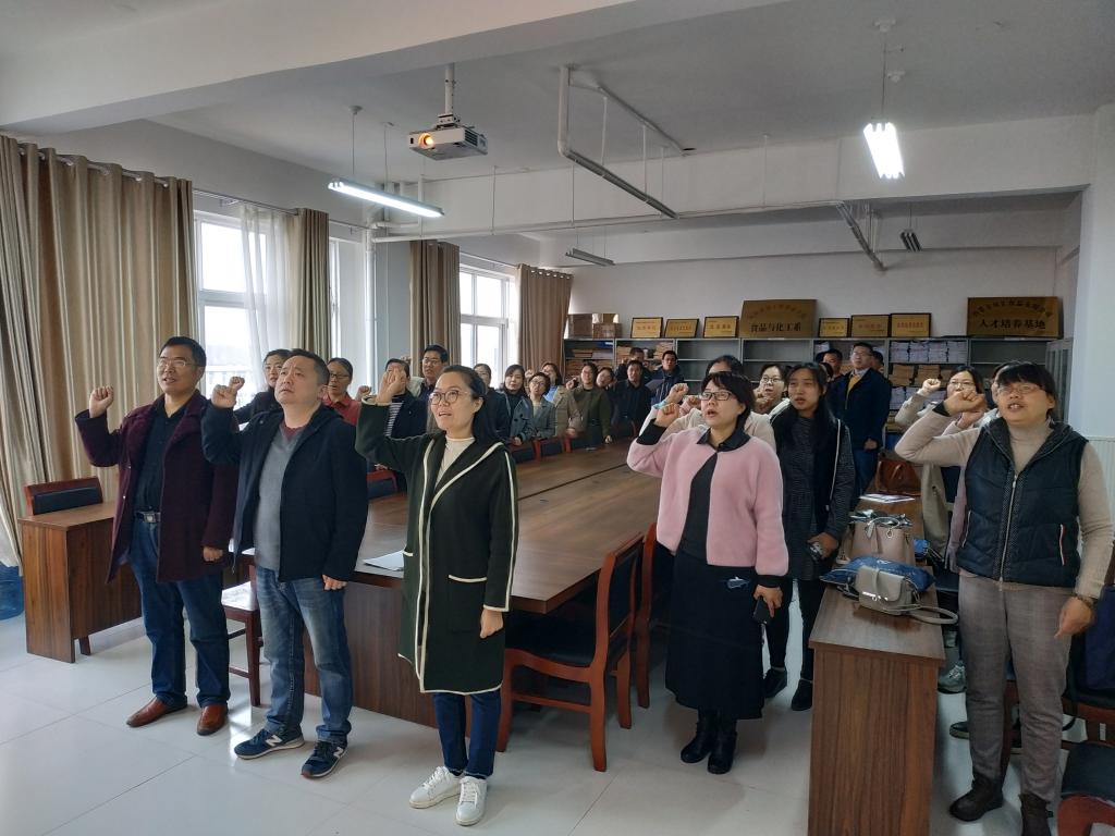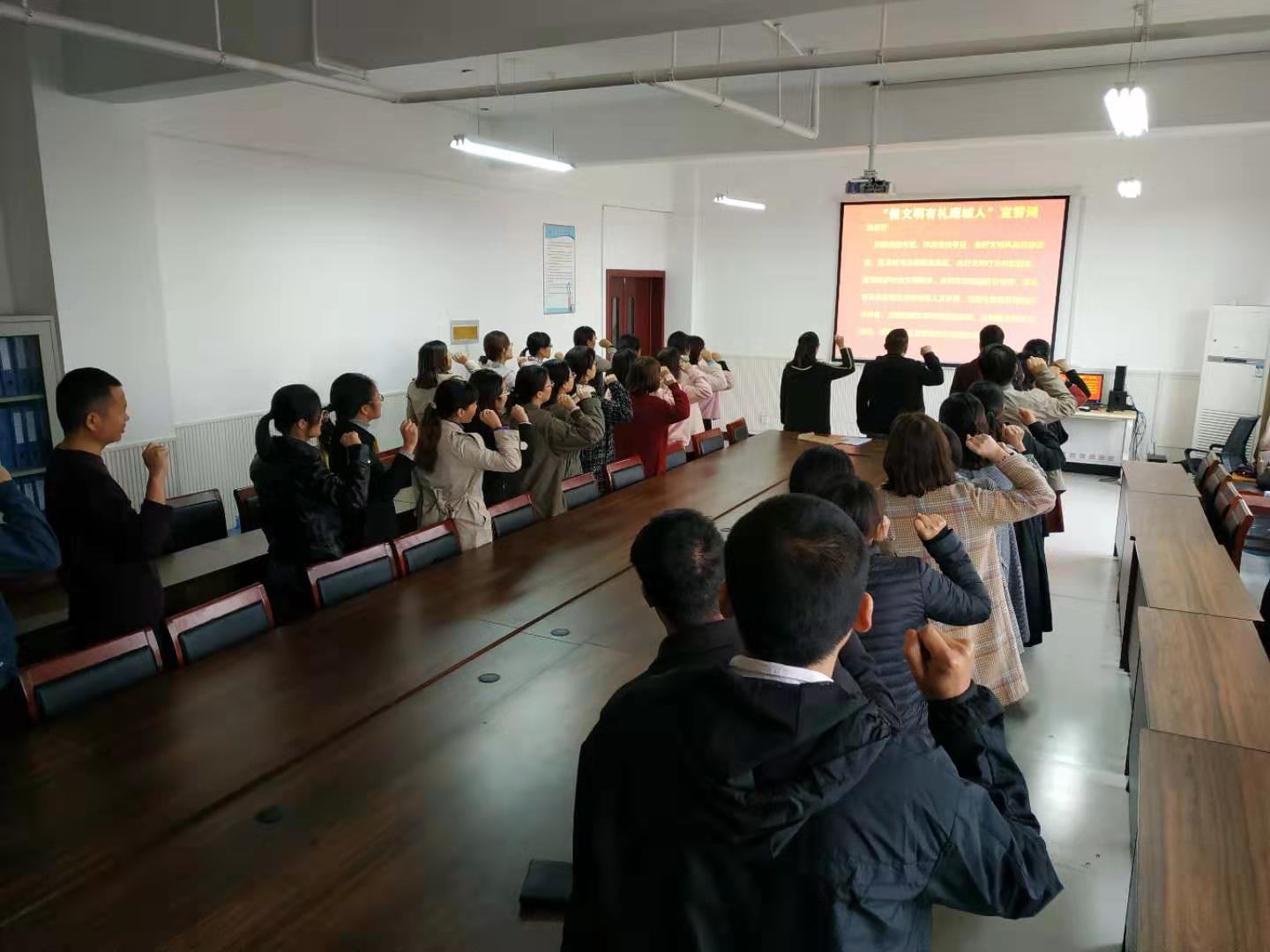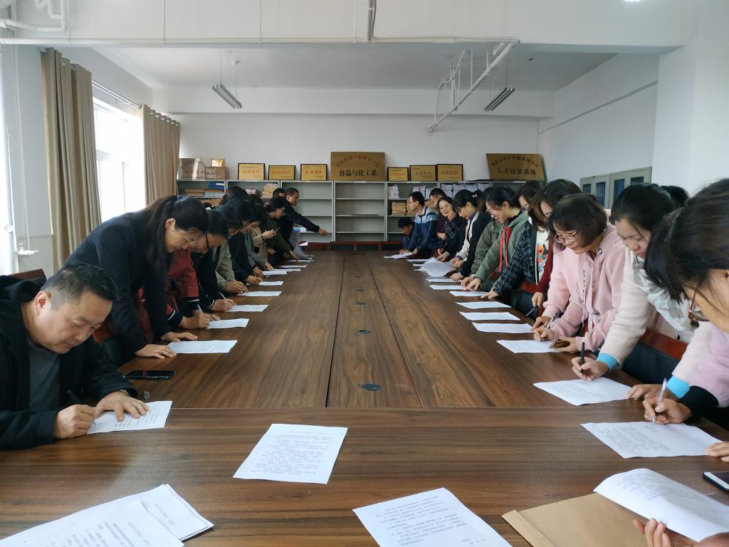 为响应院党委宣传部积极参与创建全国文明城市的号召,食品与化工系党总支积极组织全体教职工,于20191016日上午10点在五楼会议室举行承诺宣誓仪式。52名教职工集聚一堂,举起右拳郑重承诺,争做“文明有礼鹰城人”,爱岗敬业,诚信友善,多做公益,热爱自然,为把平顶山市创建成为国家。文明城市,建设美丽家园做出应有的贡献。