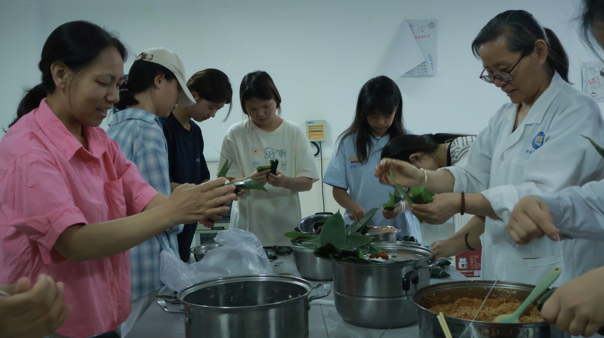 活动现场,翠绿的粽叶、雪白的糯米及饱满的花生、蜜枣等馅料在长桌上有序陈列。拥有丰富实践经验的专业教师现场手把手指导学生折叠粽叶、填充馅料、缠绕丝线,学生们从起初的生涩操作逐步熟练掌握技巧,在欢声笑语中,一个个棱角分明的粽子相继成型。