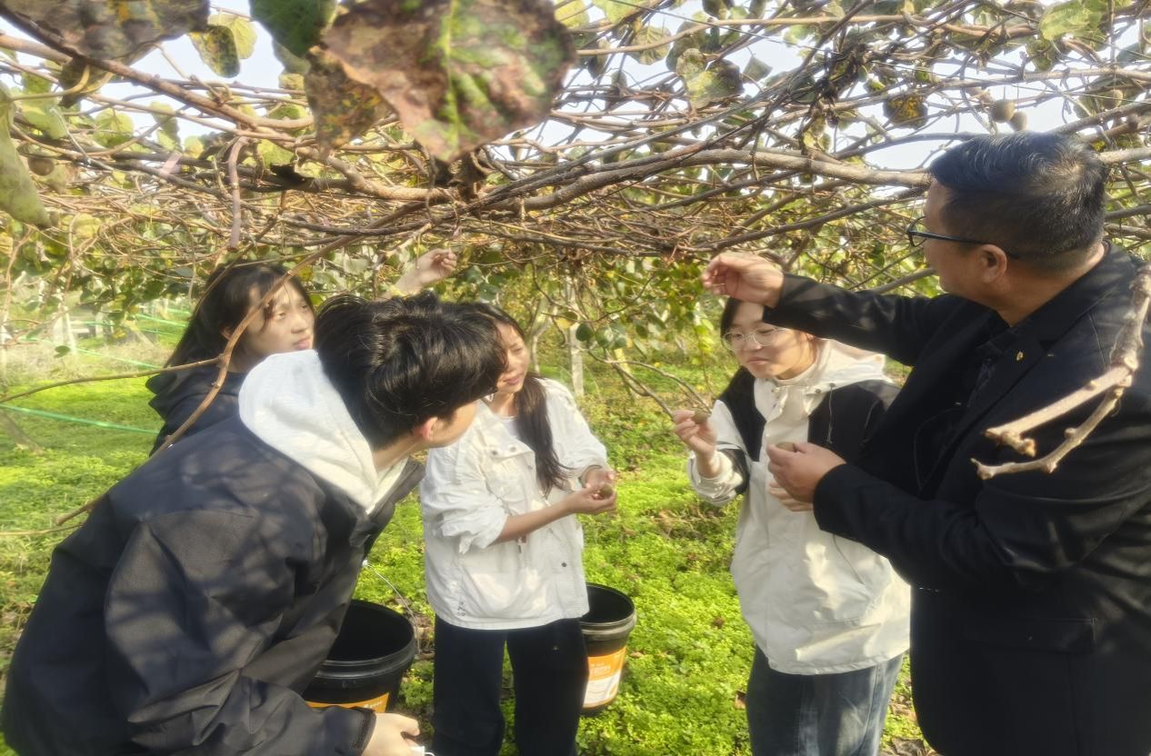 活动现场,同学们在果园管理人员指导下参与猕猴桃采摘、分拣与搬运,亲身感受农耕辛劳与收获喜悦,接受生动的劳动教育。技术专家袁维仓以果园为课堂,围绕猕猴桃的品种特性、成熟度科学判断方法、原料筛选标准等基础内容,重点讲解了果酒酿造中清洗、破碎、发酵前处理等关键技术环节,用通俗易懂的语言将专业理论与产业实际紧密结合,为同学们开设了一场生动的“果酒原料与酿造技术”移动讲堂。同学们认真聆听、及时记录,不时围绕生产难题提问交流,现场学习氛围十分浓厚。