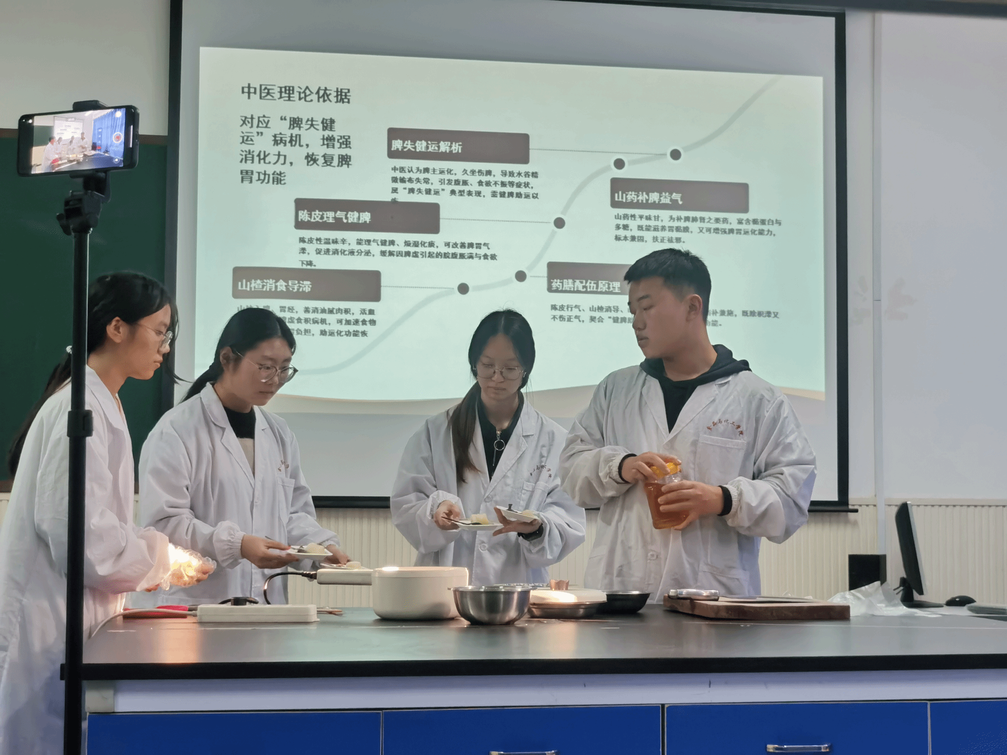本“药食同源创新大赛”面向2024级药品质量与安全专业学生,采用团队协作形式开展。各参赛队伍在创新研发过程中紧密配合,从经典方剂的现代阐释到药食同源产品的创意设计,从功效配伍的理论论证到成品试制的实践探索,全方位展现了扎实的专业功底、活跃的创新思维、良好的团队协作意识以及将传统智慧进行现代化表达的综合能力。整场赛事进程紧凑而有序,学生们的表现既充满创意又不失严谨,充分彰显了新时代健康产业领域学子守正创新、知行合一的精神风貌。