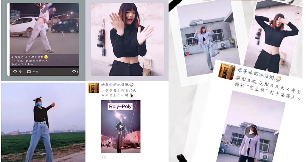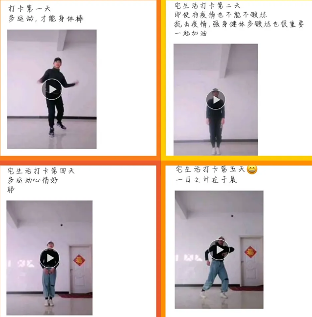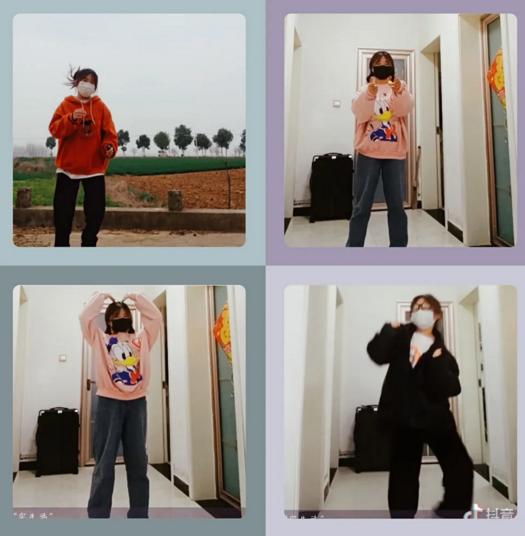18食检二班张岚根据现有条件,将小小庭院变成小型舞蹈排练厅,利用网络设备制作舞蹈小视频,并坚持打卡。