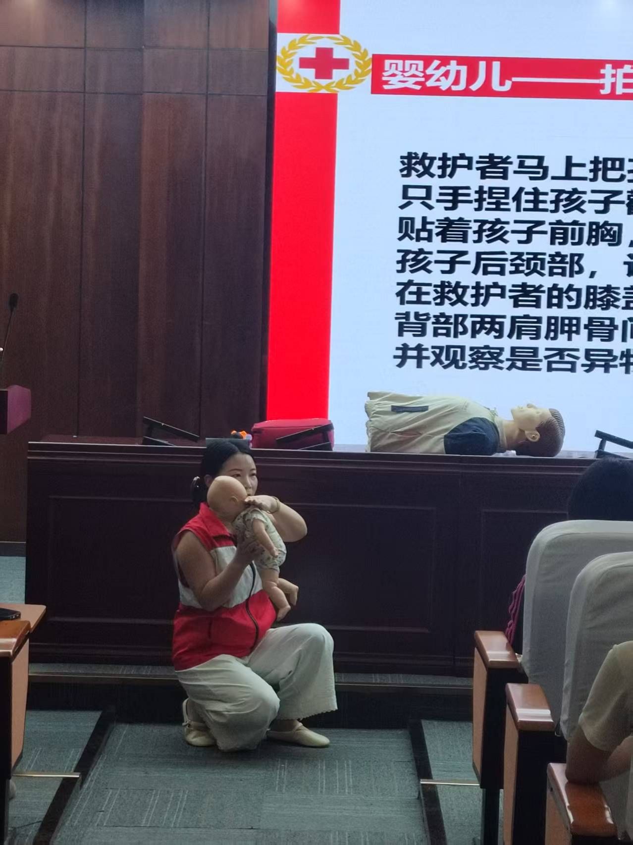 培训中,市红十字会专业讲师结合真实案例,强调了应急救护在“黄金四分钟”内挽救生命、减轻伤残的至关重要性。 重点讲授了海姆立克急救法,详细演示了针对成人、儿童、婴儿的不同操作要点,并讲解如何识别窒息征象(如无法咳嗽、呼吸困难)、快速评估伤者状况、正确摆放复苏体位(侧卧位)以及有效呼救,确保昏厥者在专业救援到达前得到妥善安置。