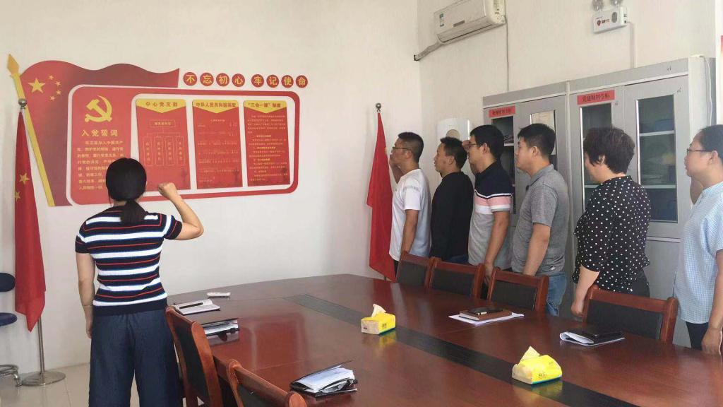 2019年9月26日上午,食检中心党支部全体党员在党员活动室鲜红的党旗下,高举右手、庄严宣誓,重温入党誓词。