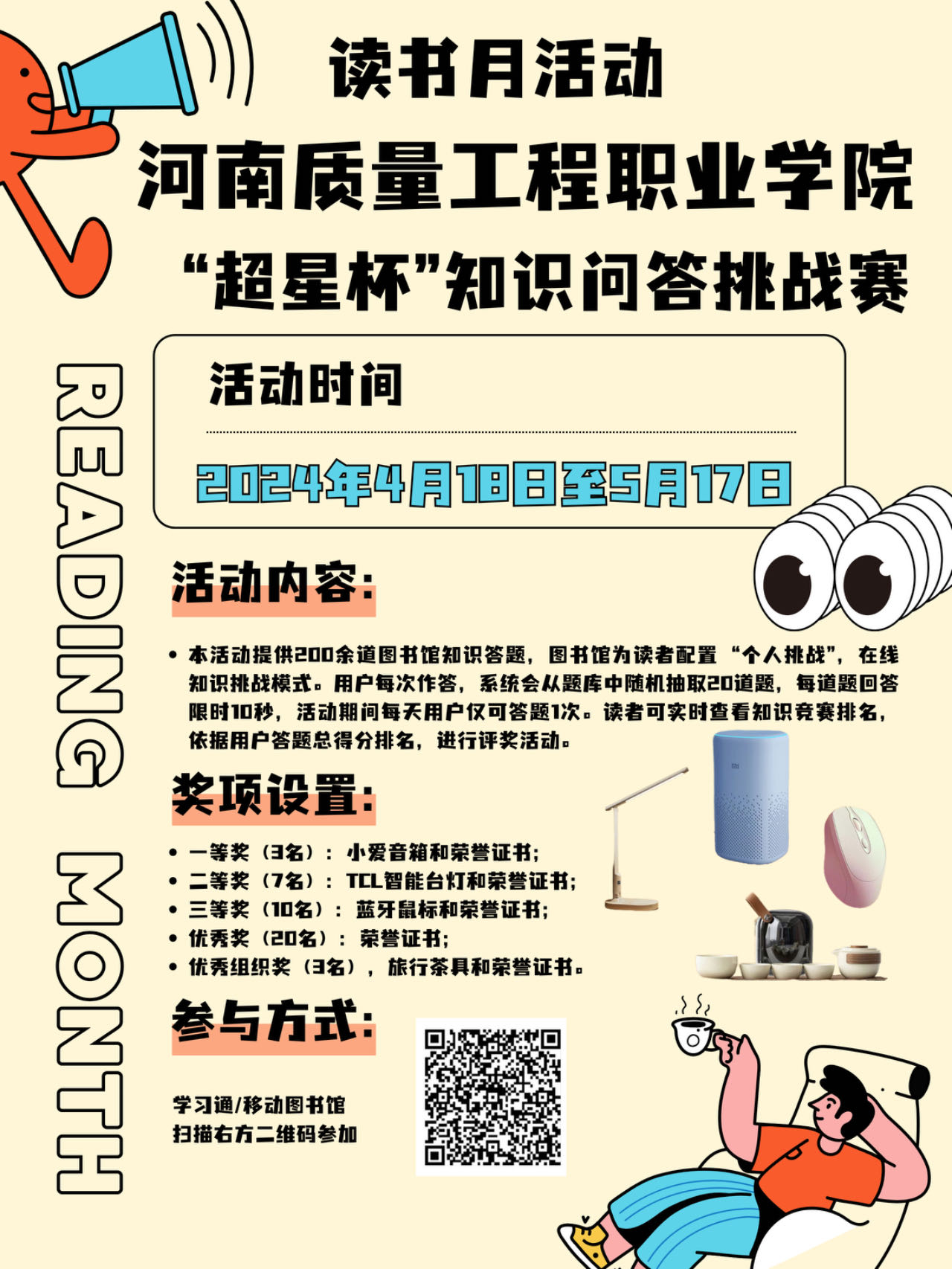 (1)活动内容:通过学习通活动入口答题,本活动提供200余道图书馆知识答题,图书馆为读者配置 “个人挑战”,在线知识挑战模式。用户每次作答,系统会从题库中随机抽取20道题,每道题回答限时10秒,活动期间每天用户仅可答题1次。读者可实时查看知识竞赛排名,依据用户答题总得分排名,进行评奖活动。参赛规则详见图书馆网站。