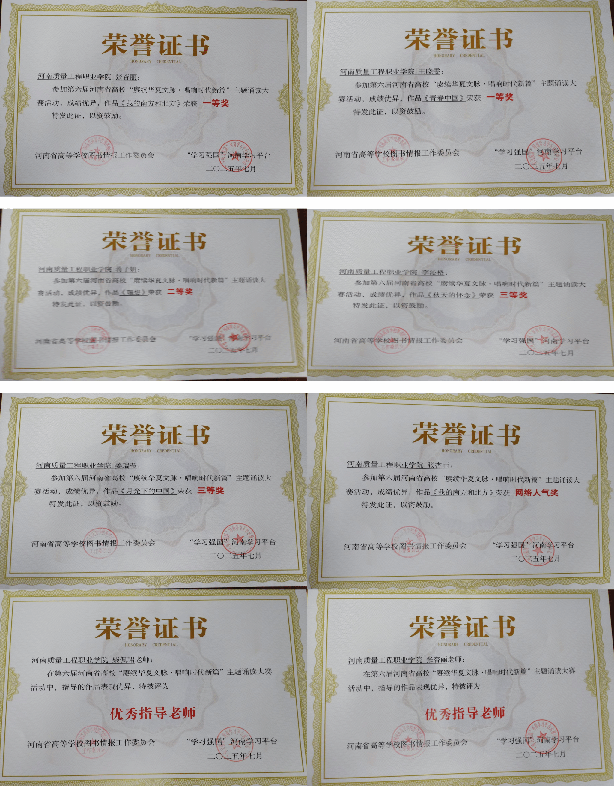 喜报|我院师生在第六届河南省高校“赓续华夏文脉·唱响时代新篇”主题诵读活动大赛中获奖,此次大赛进入决赛10名,其中有5人获得6类奖项,教师组张杏丽《我的南方和北方》视频作品获得一等奖及网络人气奖。学生组王晓雯《青春中国》视频作品获得一等奖,蒋子妍《理想》音频作品获得二等奖,姜瑞莹 《月光下的中国》》音频作品获得三等奖,李沁格 《秋天的怀念》视频作品获得三等奖。