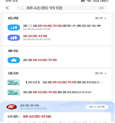 1、进入学习通首页,搜索框输入:移动图书馆,应用程序里选择“移动图书馆”