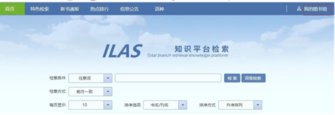 4、登录 “我的图书馆”续借:登录 ILAS 检索页面:(/index.html),点击右上角“我的图书馆:”