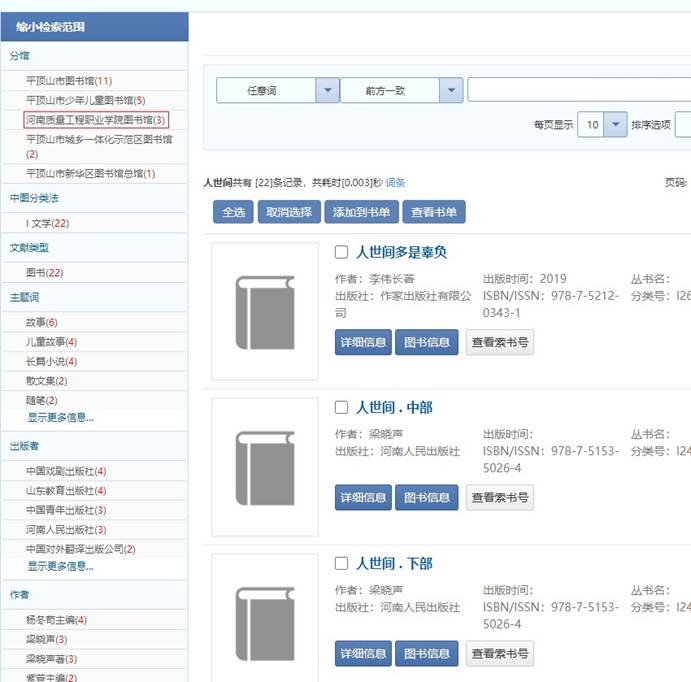 3、在检索结果中,点击左边缩小检索范围,可以看到我馆检索到的图书信息;