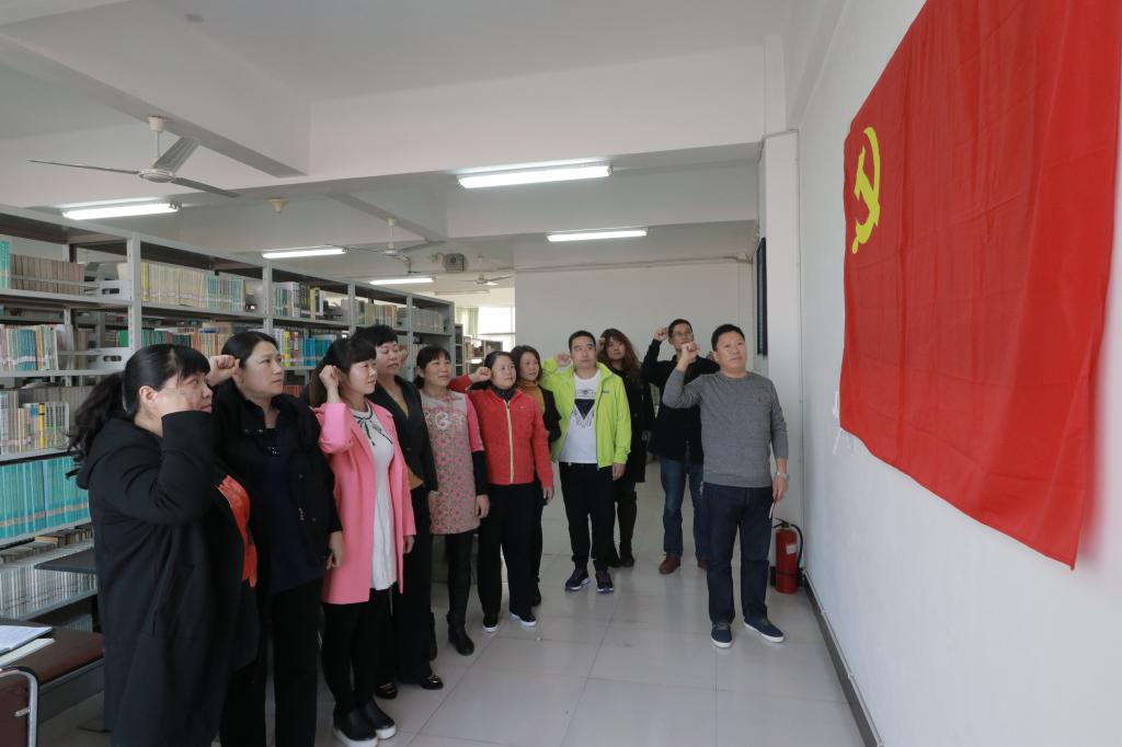 面对党旗,图书馆支部李国山书记带领全体党员宣读誓词:“我志愿加入中国共产党,拥护党的纲领,遵守党的章程……”。党员们举起右拳,在鲜红的党旗下庄严宣誓,立下自己对党忠诚的誓言,表达了为党的事业奋斗终生的决心和愿望。庄严而肃穆的重温入党誓词活动,使每一位党员再一次接受了心灵的洗礼,进一步坚定了理想信念和历史责任感。党员们纷纷表示,今后要不断增强党员意识,积极发挥先锋模范作用,做一名“让党放心、让人民满意”的合格党员。