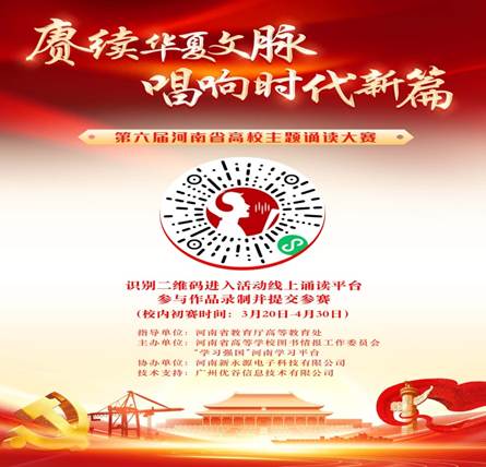 初赛:由“第六届河南省高校主题诵读大赛”组委会指导,组委会提供活动平台,图书馆组织初赛活动、评选优秀作品(设一等奖2名、二等奖3名、三等奖5名,颁发证书及奖品)。