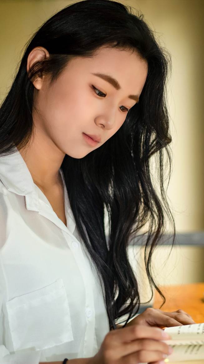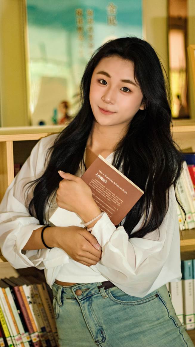 在第一张照片里,她低头专注于书页,柔和的光线洒在脸庞,似是沉浸在文字编织的世界中,那神情里透着对知识的虔诚与探索欲。第二张照片中,她怀抱书本,眼神明亮而自信,背后的书架与隐约可见的馆内景致,勾勒出浓厚的文化氛围,仿佛在诉说着书籍给予的力量与从容。第三张照片,她于书架前静读,四周排列有序的书籍,是知识的海洋,她似一叶求知的扁舟,在其中悠然探寻。