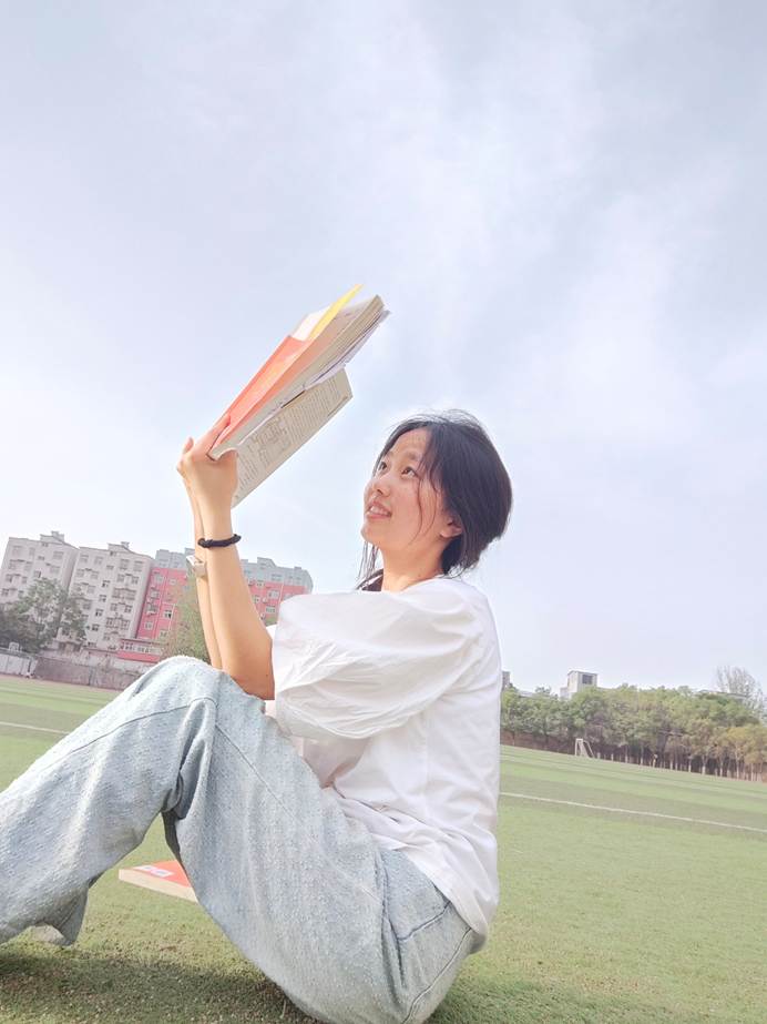 阳光洒在绿茵场上,她抱着书坐在操场上,嘴角挂着浅浅的笑。微风翻动书页,发丝轻扬,偶尔抬头望向远处奔跑的身影,又低头沉浸在字里行间,仿佛整个世界都安静下来。