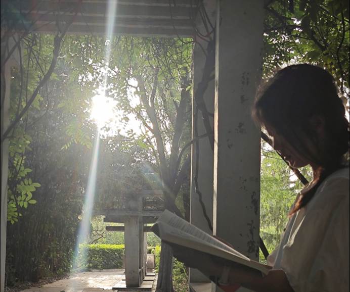 夕阳漫过廊檐,她坐在斑驳的光影里。书页沙沙作响,风拂起她耳畔的碎发。一个人享受知识的力量、享受光的张扬、风的自由,整个长廊成了故事的注脚。
