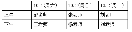 国庆假期期间,有心理咨询需要的同学可通过电话7668257预约或者到心理健康中心预约,中心安排有心理咨询老师为学生提供线上以及线下咨询服务,帮助同学们解决心理困惑和烦恼。排班时间如下: