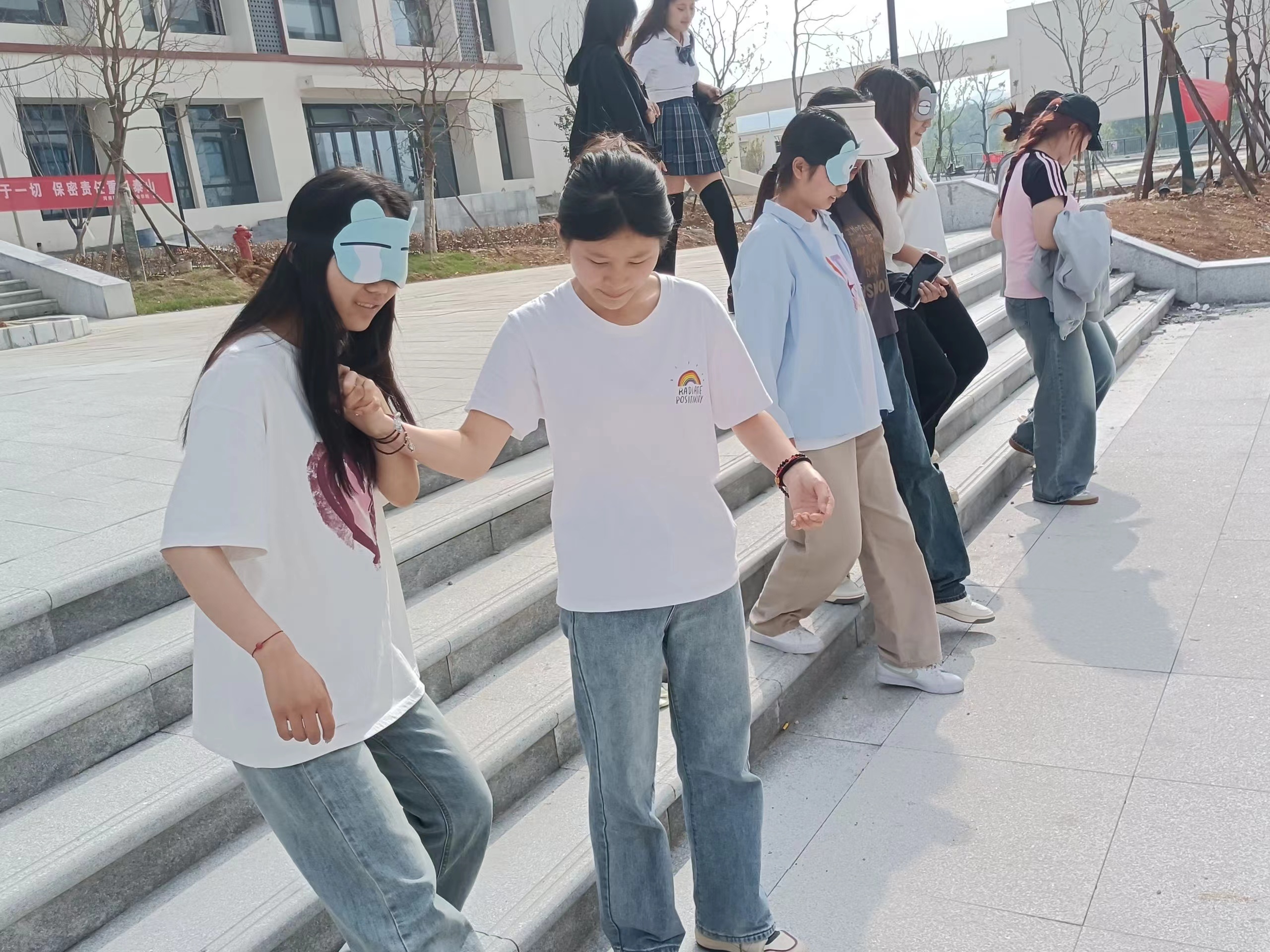 活动规则:两人一组,一人蒙眼扮演“盲人”,另一人用语言引导“盲人”前行,在途中遇到障碍时要保护好“盲人”,结伴走完规定路线,然后交换角色。最终,所有同学都克服各种障碍,出色地完成了任务。