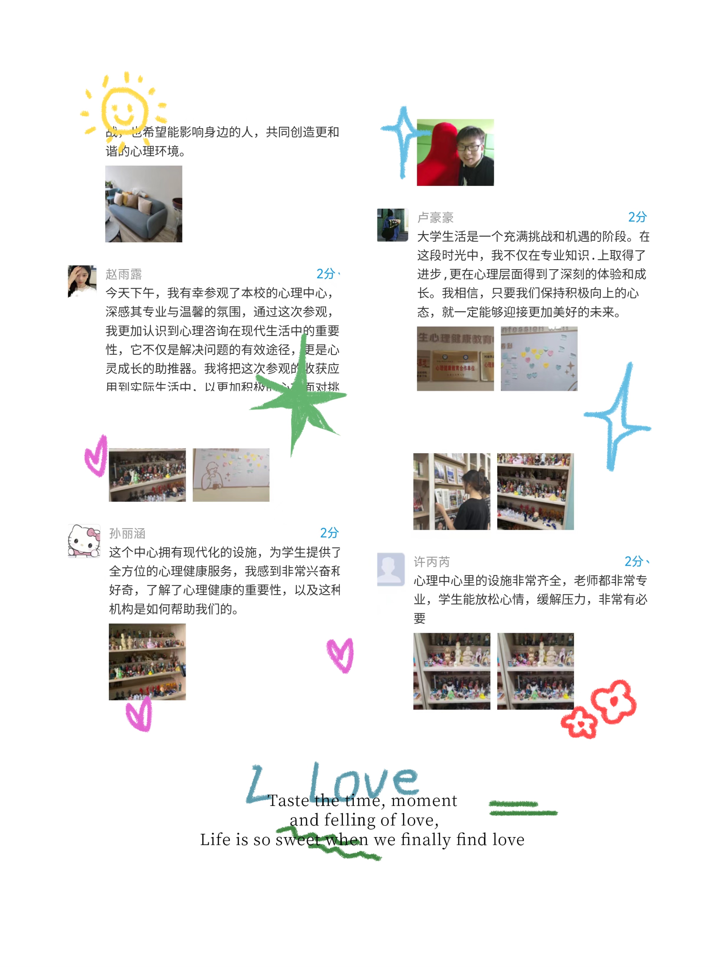 通过此次参观体验实践课程,帮助同学们全方位了解了心理健康教育工作的内容及心理辅助设备功能,消除了同学们对心理咨询工作的戒备心,打破了同学们对心理健康教育工作的神秘感,激发了同学们自我探索的好奇心,心理健康教育中心会坚持“以学生为中心”服务和帮助同学们,助力同学们健康成材!