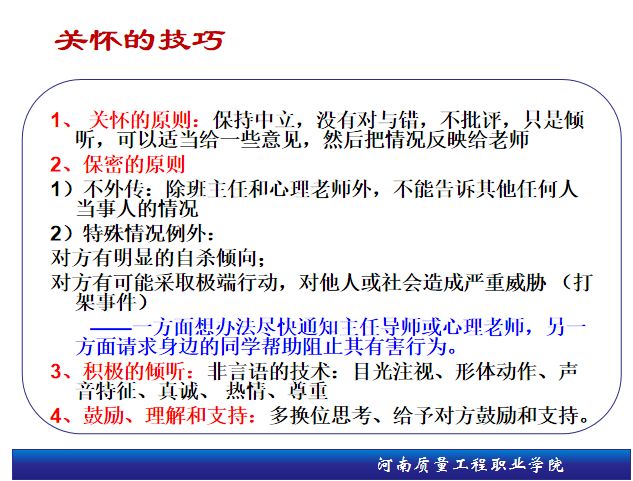 最后,分享了在与同学们沟通和开展工作时的实用技巧。如积极倾听,用同理心去理解同学们的困扰;保持中立和客观的态度,不轻易评判;采用合适的语言和沟通方式,营造安全信任的氛围,让同学们愿意敞开心扉。