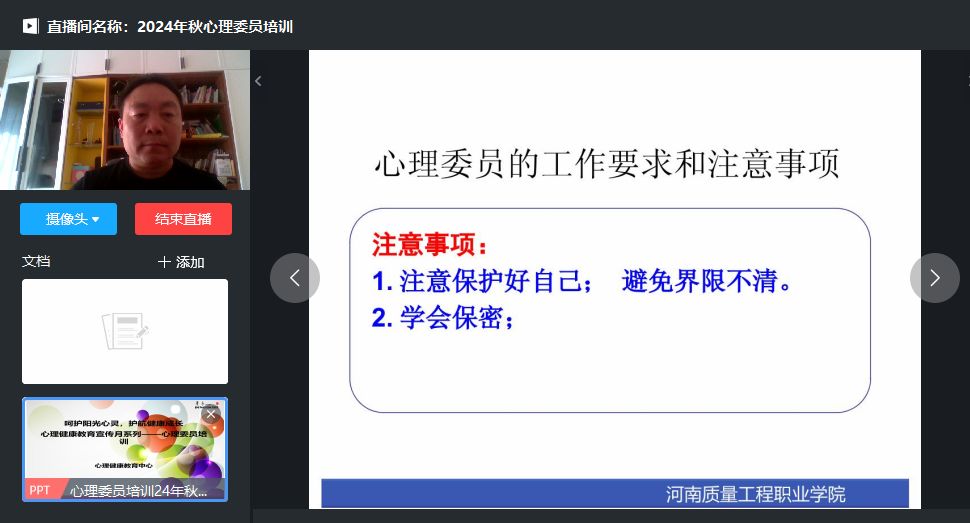 为进一步加强心理健康教育学生骨干队伍建设,11月5日,我校心理健康教育中心通过学习通网络直播的形式,开展了班级心理委员及宿舍心理信息员主题培训活动,665名同学参加。