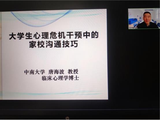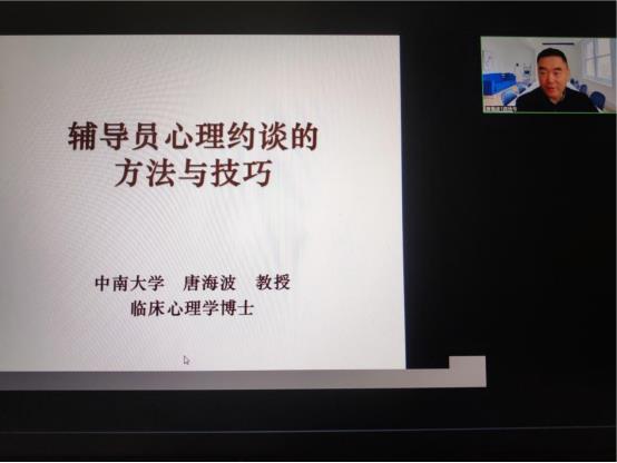 培训班通过腾讯会议进行,由中南大学心理健康教育与咨询专家唐海波教授主讲。培训内容分“辅导员心理访谈技巧”“危机干预中的家校沟通技巧”“心理危机的识别方法”“自杀高危学生的识别技术”四大模块。培训中,唐教授就辅导员日常思政教育工作与专业心理咨询工作之间的异同、危机干预与心理咨询的异同、家校沟通的难题等问题做了详细的分析与讲解,参会老师就工作中的遇到的困惑进行了交流和探讨。