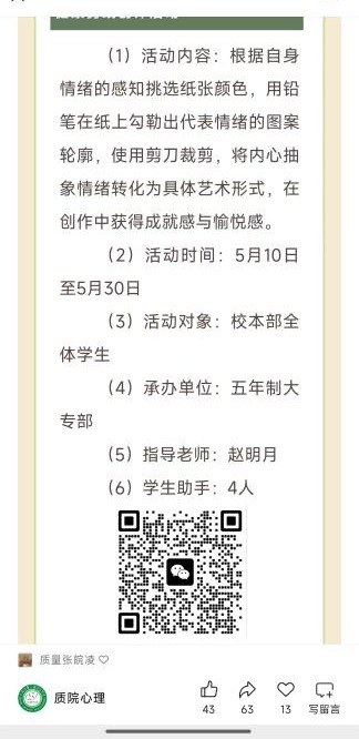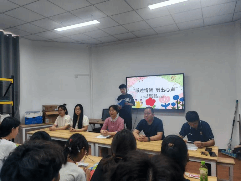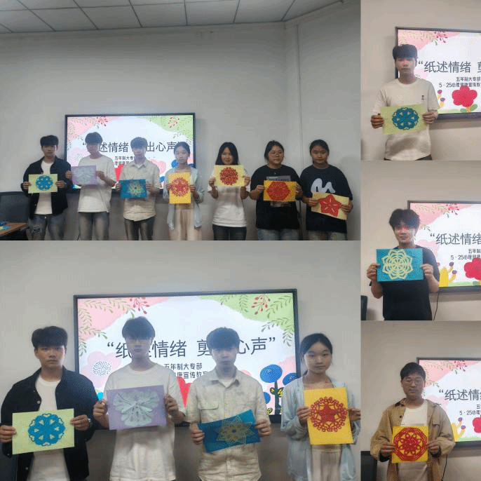 为加强青少年心理健康教育引导学生合理表达情绪,营造健康和谐的育人氛围五年制大专部于5月15日下午,格物楼106实训教室组织举办了以纸述情绪 剪出心声”为主题的心理健康剪纸创评活动,旨在以剪纸为载体,通过艺术创作的形式,引导学生将内心抽象情绪转化为具体艺术形式,帮助学生探索和表达情绪,为学生提供一个情绪表达的出口,增强情绪认知能力,促进心理健康。