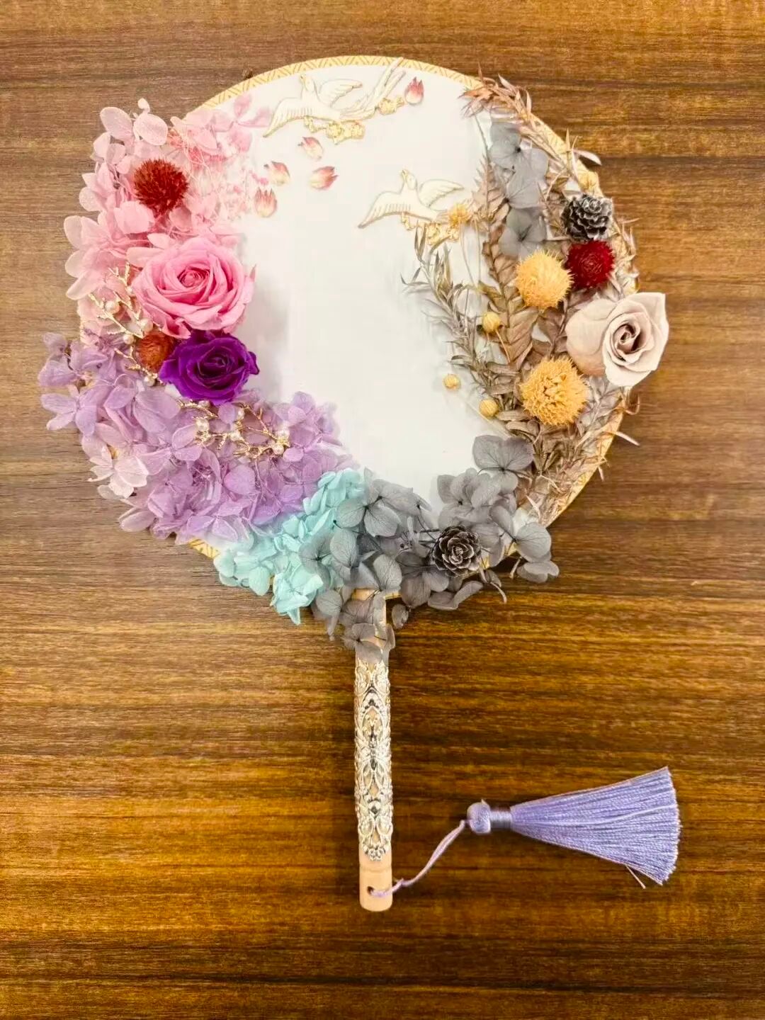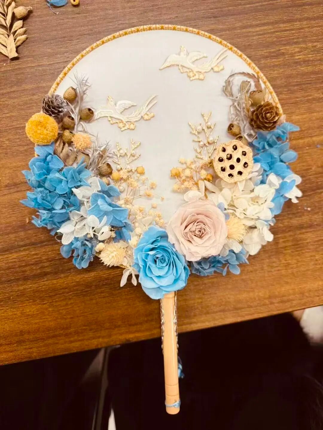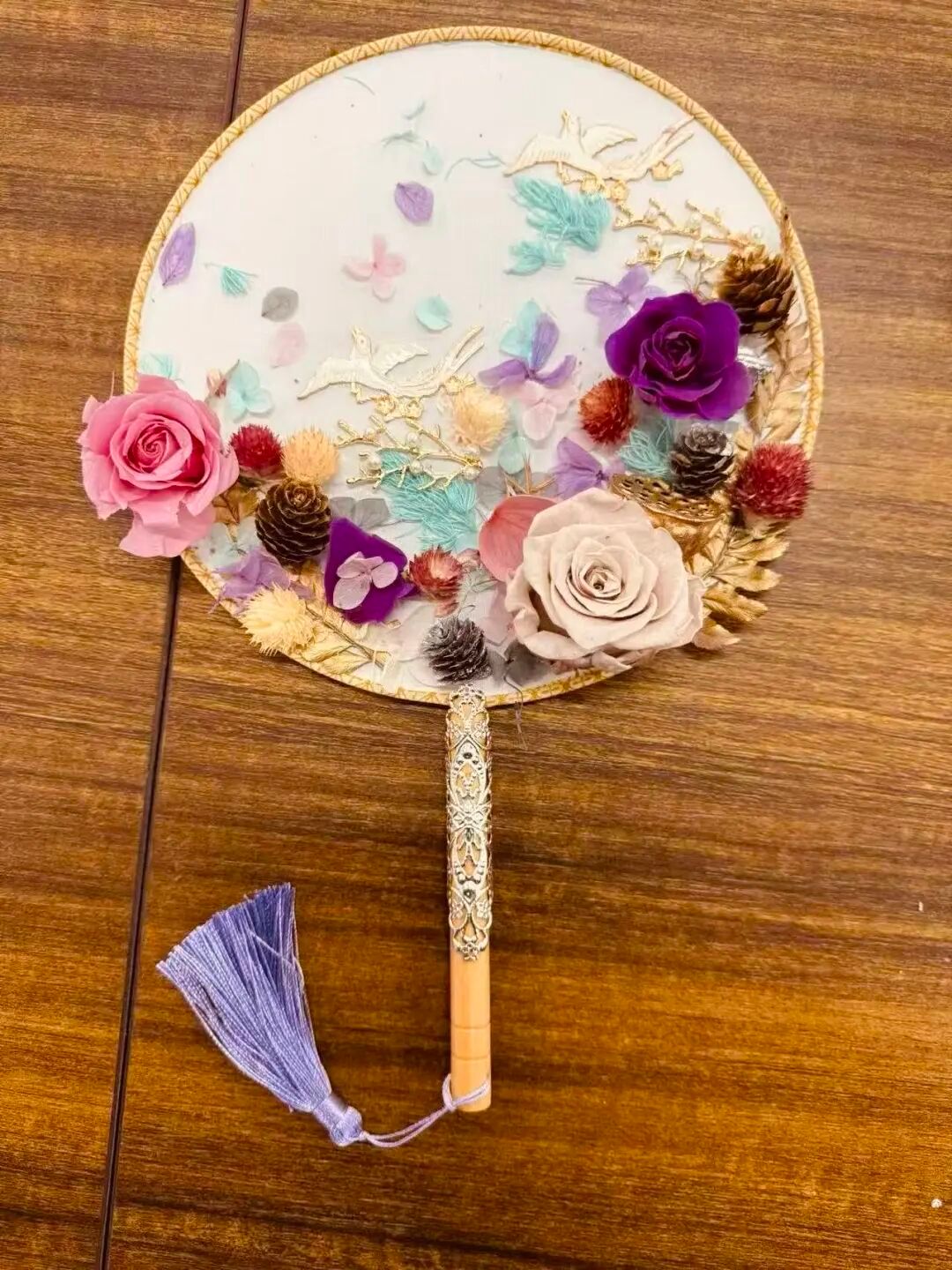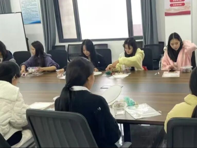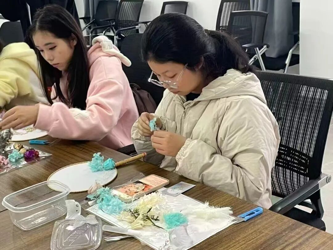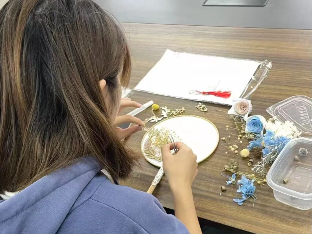 活动现场布置雅致,学院提前准备了空白团扇、装饰品、胶水等材料,让同学们能自由发挥创意。同学们拿起扇子,在扇面上粘贴装饰、搭配元素,大家或拼贴清新淡雅的草木纹样,或粘贴各类花朵饰件,将内心的情绪与期许融入手工创作之间。
