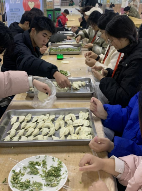 活动现场,协会成员们提前准备好了丰富的食材,新鲜的馅料、筋道的面皮一应俱全。大家围坐在一起,纷纷大显身手。一边包着饺子,一边交流包饺子的技巧与心得,欢声笑语不断,现场气氛十分热烈。有的同学手法娴熟,包出的饺子形状美观、大小均匀;有的则是初次尝试,虽然饺子的模样略显“独特”,但也充满了新意。大家齐心协力,不一会儿,案板上就摆满了一排排饺子,仿佛是一件件精美的艺术品。