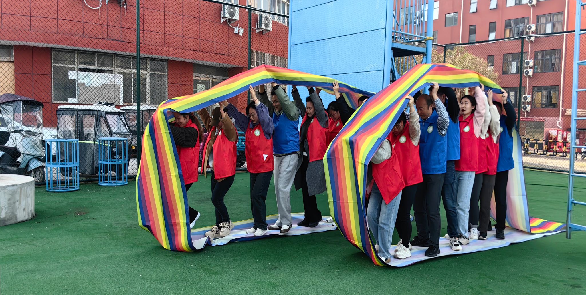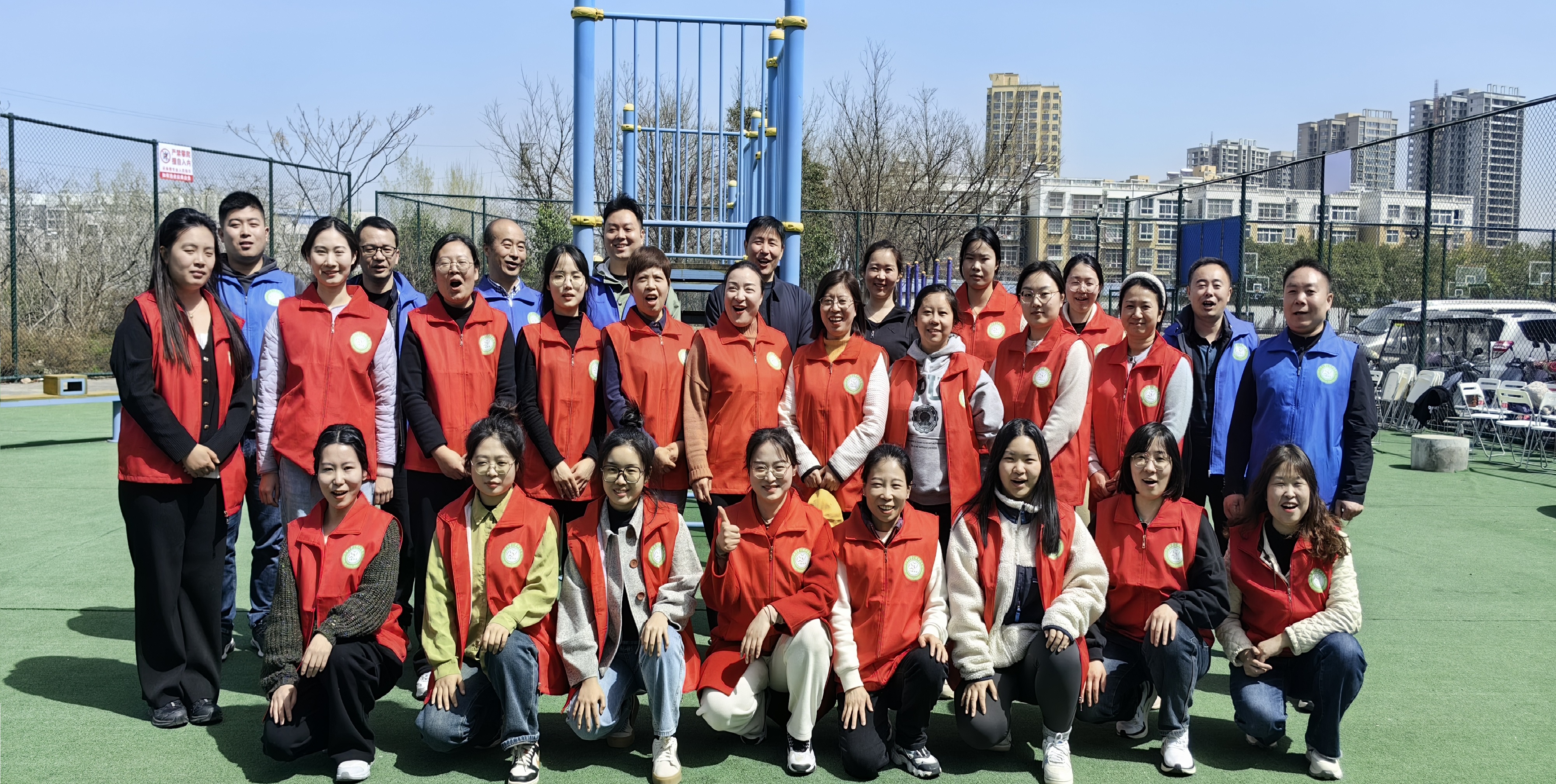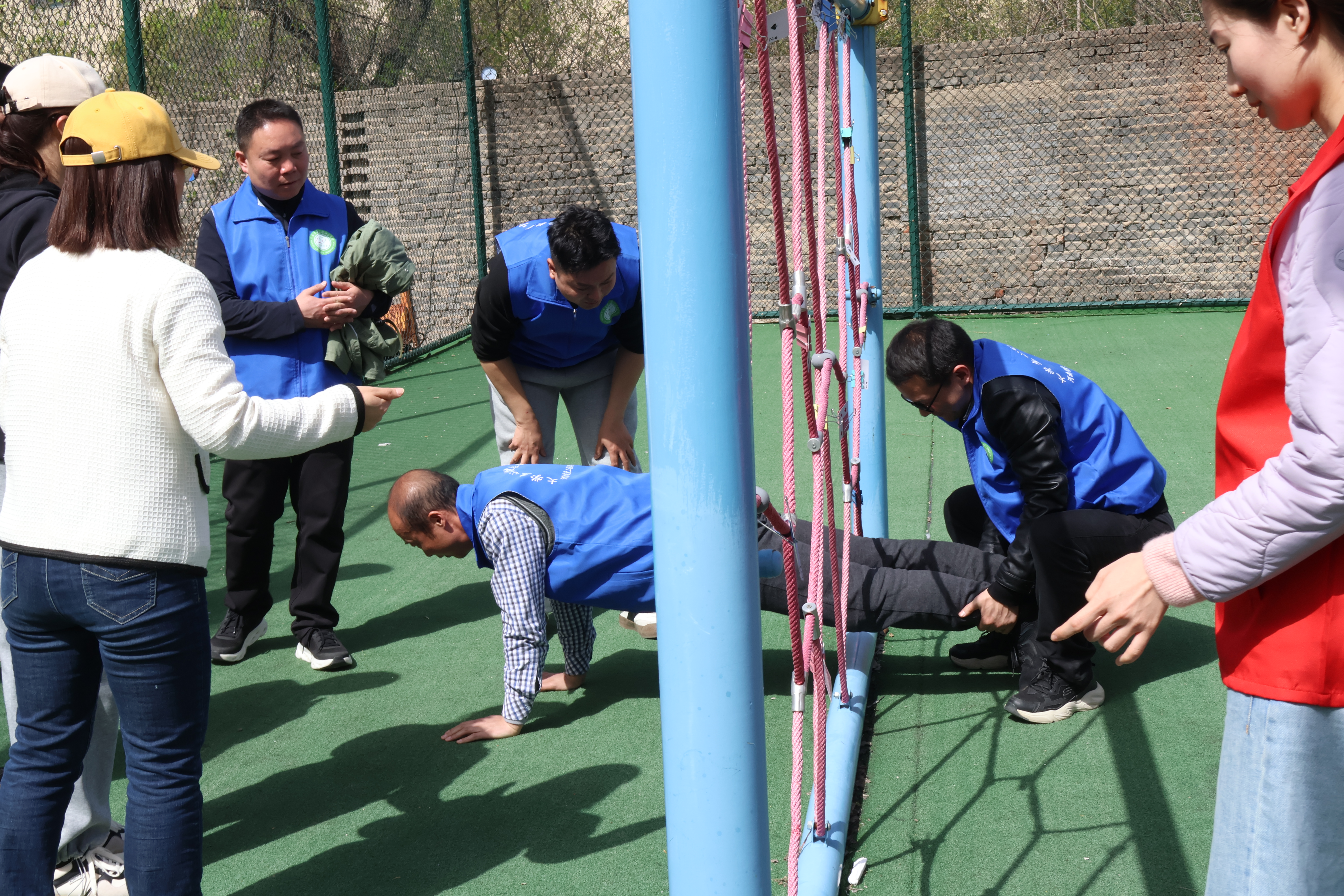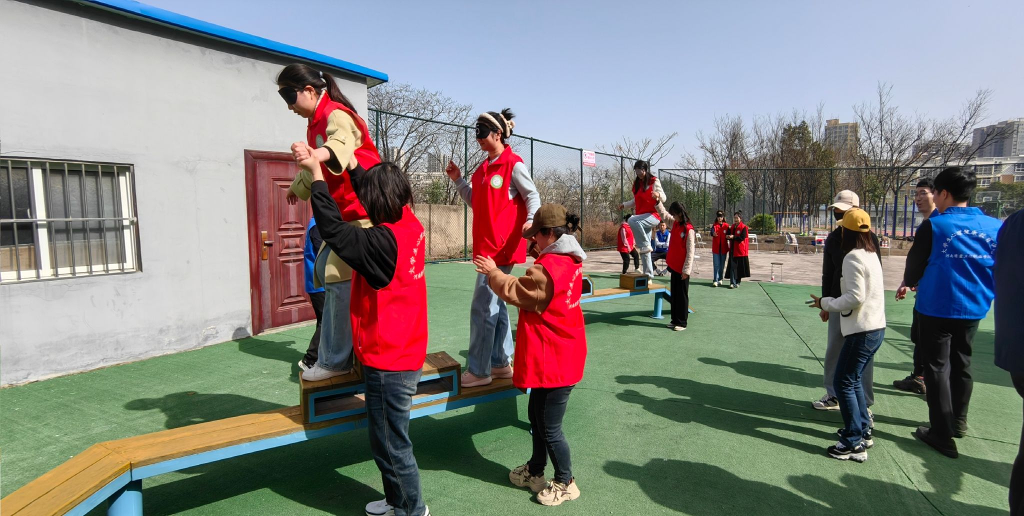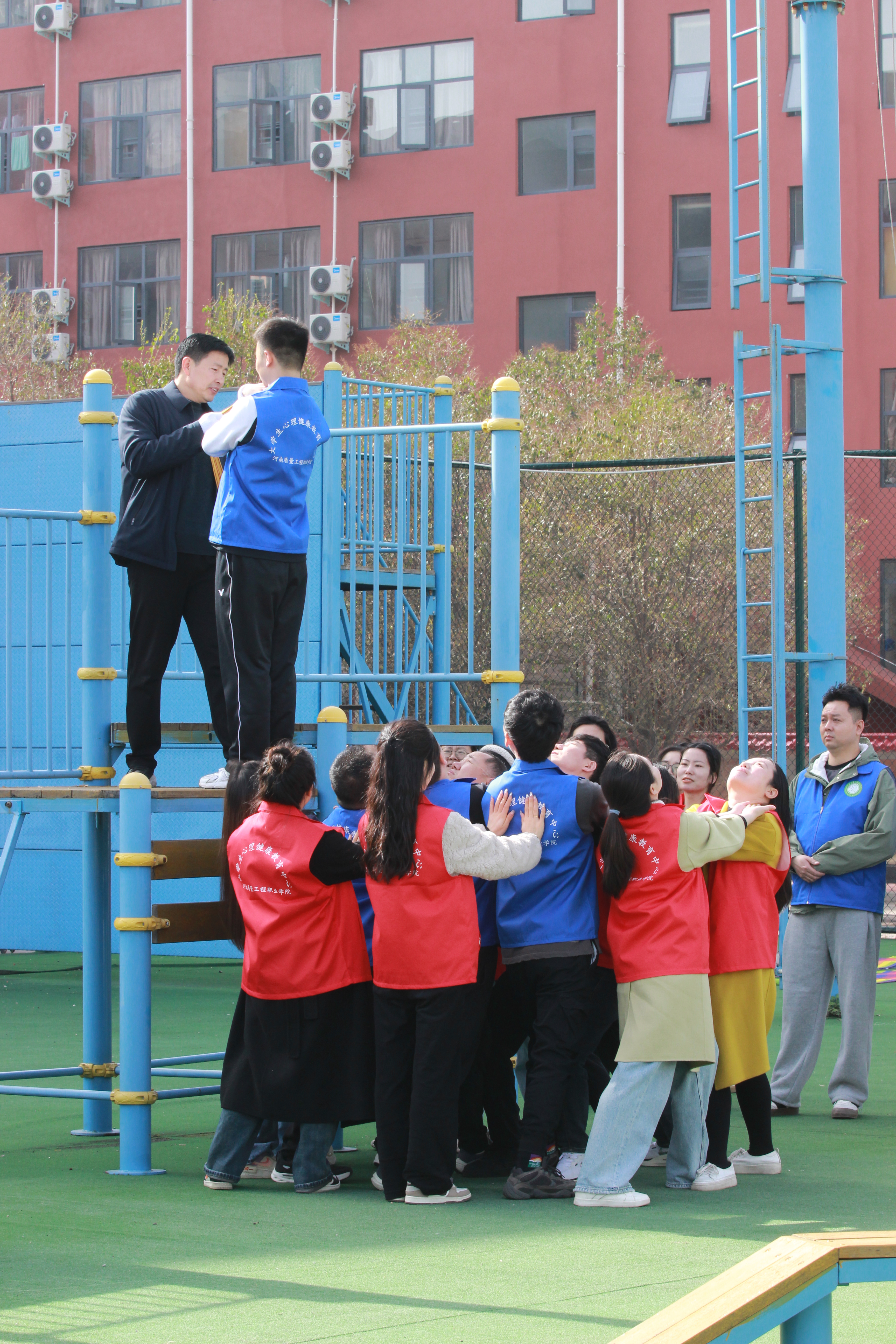 3月28日上午,开展了室外拓展训练活动。首先,刘翳菲老师的“暖场活动”,通过抽卡片、肢体表演和自我描述环节,使来自不同院部的老师相互认识、彼此了解;然后,户外实践教育拓展培训师田浏阳主任和韩延歌老师带领大家开展“信任背摔”活动,在指导老师的详细讲解及动作示范后,队员们不断突破自我,一次次勇敢地从高台上向后倒,同伴们更是竭尽全力托举起挑战者,全程气氛热烈、掌声不断;最后,大家分组体验了“穿越电网”“盲目障碍”和“车轮滚滚”三项活动,成员通过全盘谋划、合理分工,终于成功逃出电网;通过预先沟通、默契配合顺利跨越障碍;通过积极协商、调整策略,终于使团体车轮滚滚向前!