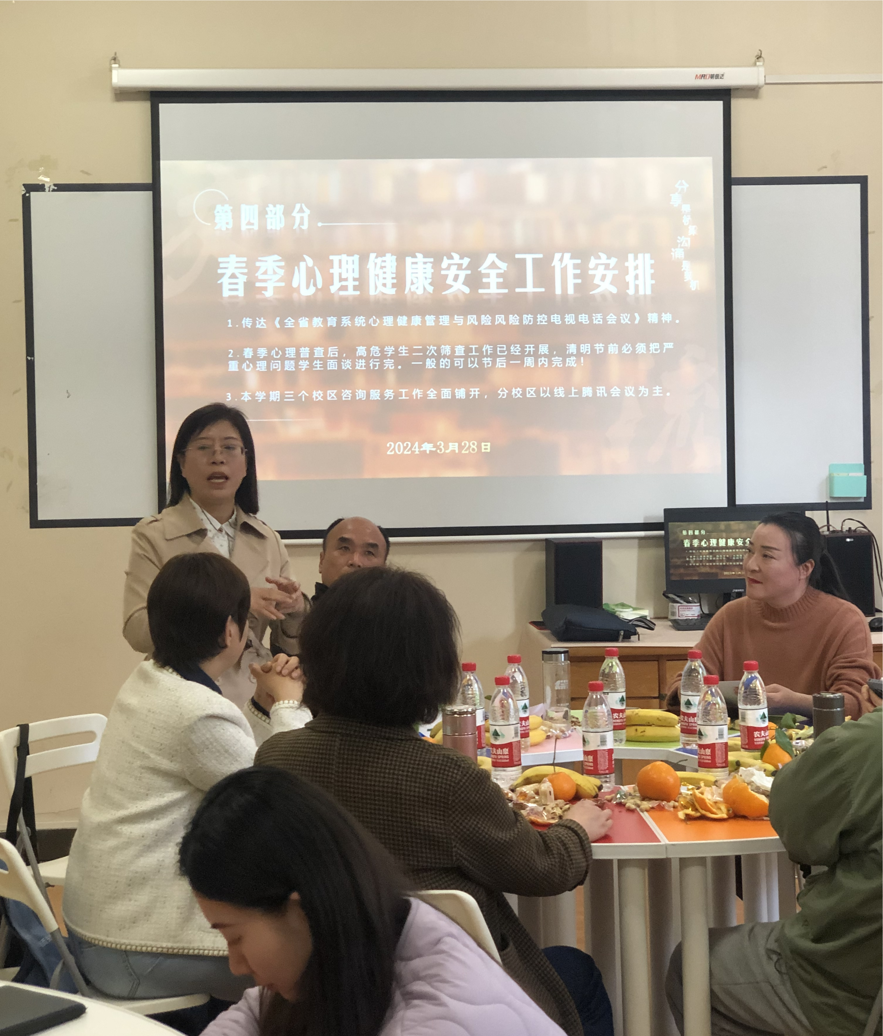 培训学习结束后,在团体活动室开展了“分享交流茶话会”活动。大学生心理健康教育中心主任易晓敏邀请各位站长、心理专员分享了此次培训的感悟,谈到了各二级心理站的建设情况、遇到的困难和本学期拟开展特色活动,大家畅所欲言,气氛和谐。会上还传达了《全省教育系统心理健康管理与风险风险防控电视电话会议》精神,并安排了2024年春季心理健康安全工作。