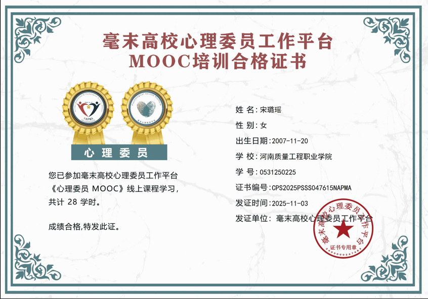未来,我将继续秉持初心,以更饱满的热情参与校园心理健康工作,用微光汇聚星河,以初心践行使命,持续用温暖之力护航同窗心理健康,为营造和谐美好的校园氛围不懈努力!
