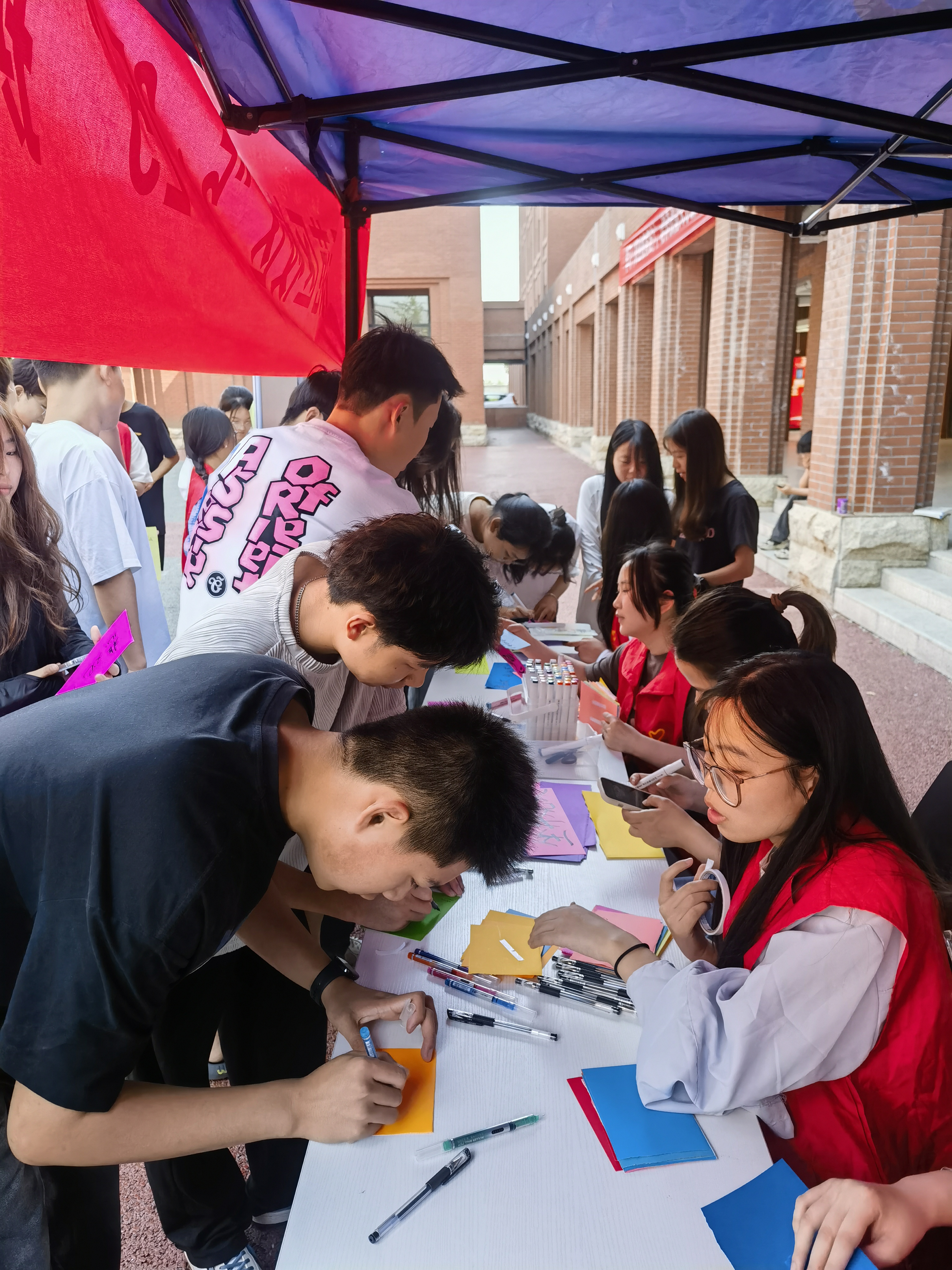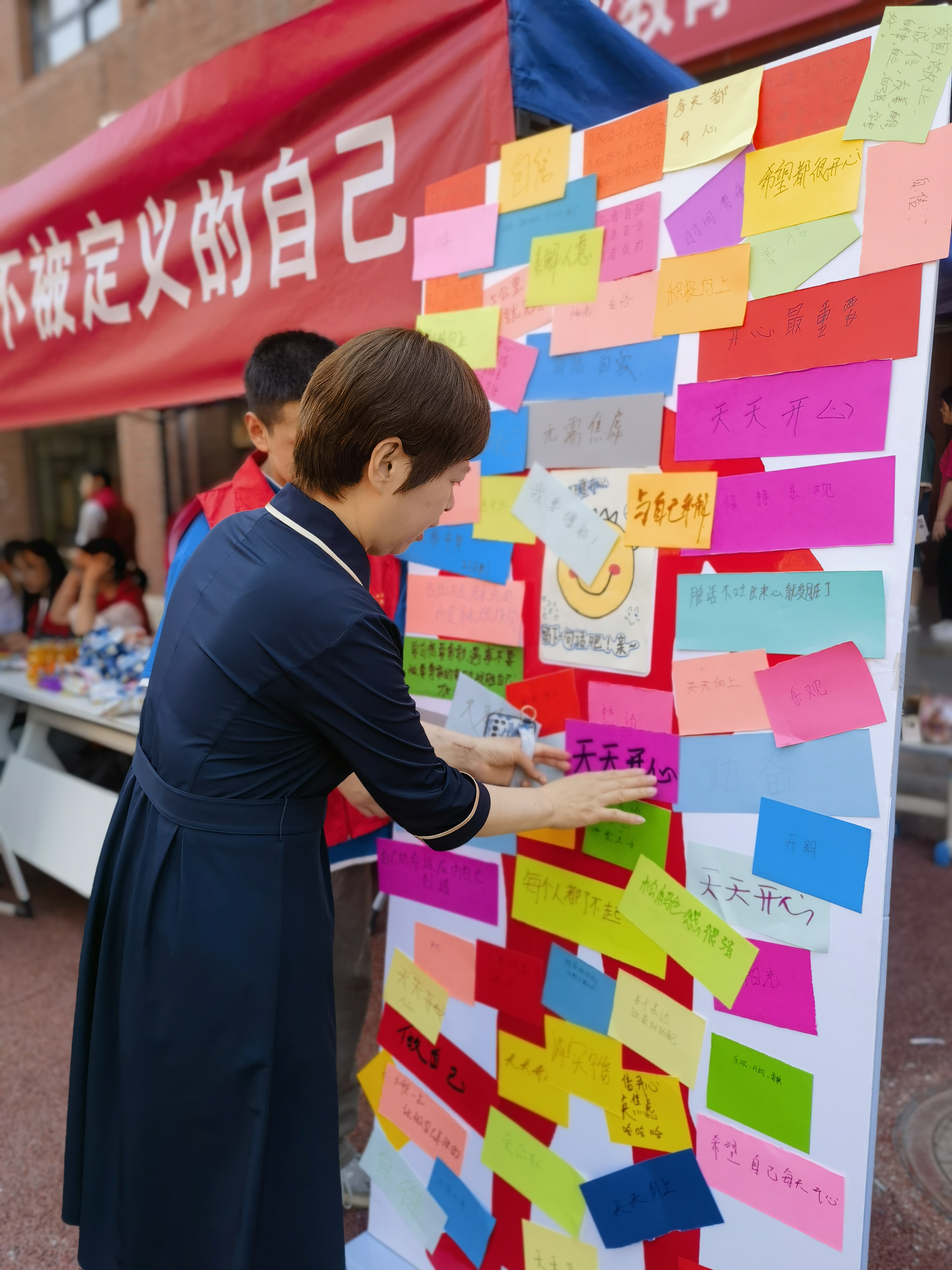 活动现场,大家认真看着贴满标签的立牌,仿佛想到了被别人偏见定义的自己,走上前亲手撕下困扰自己的标签,象征着摆脱束缚,迈向自由。同学们又挥笔写下对自身的积极肯定和对未来的美好期待,郑重贴在立牌上,展现了不畏挑战、蓬勃向上的力量。