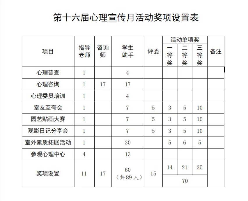 根据活动具体要求,宣传月系列活动将设立优秀组织奖3个,优秀指导教师11明,优秀评委15个,优秀咨询师17个;优秀学生助手60个,活动单项奖70个。