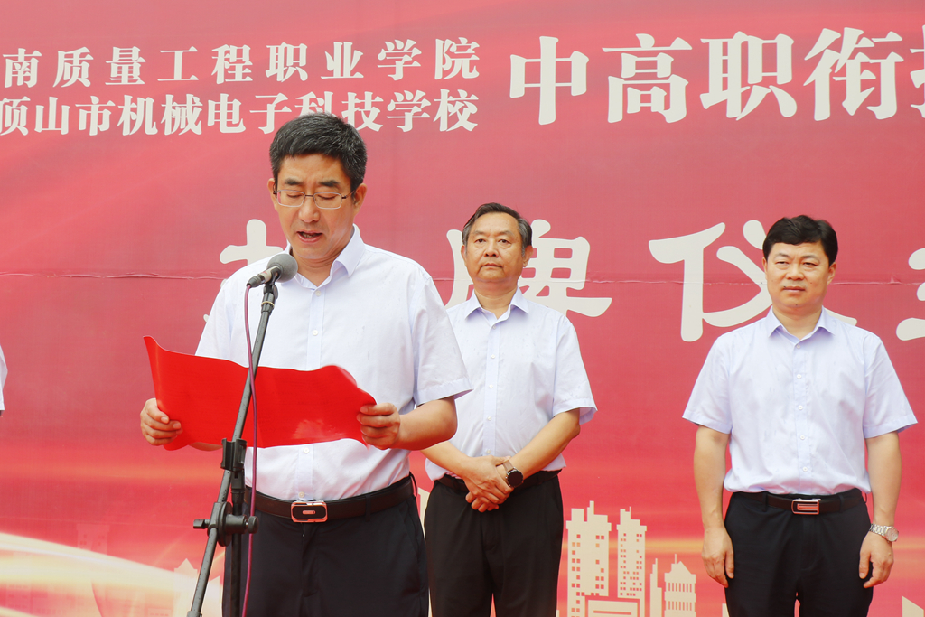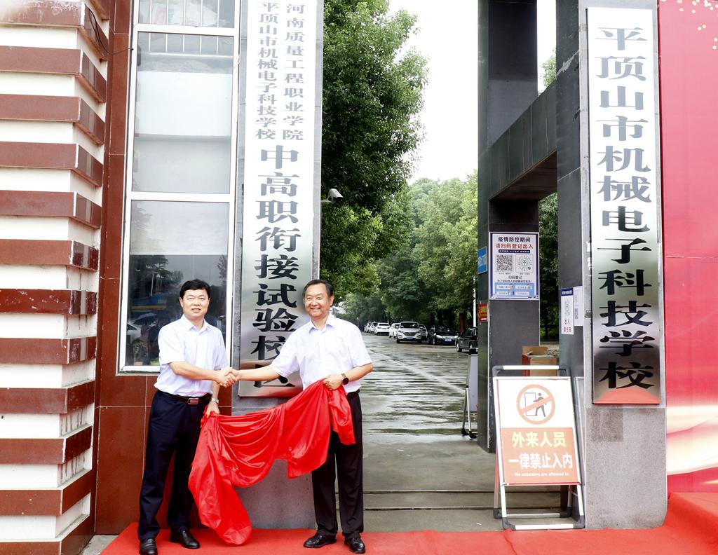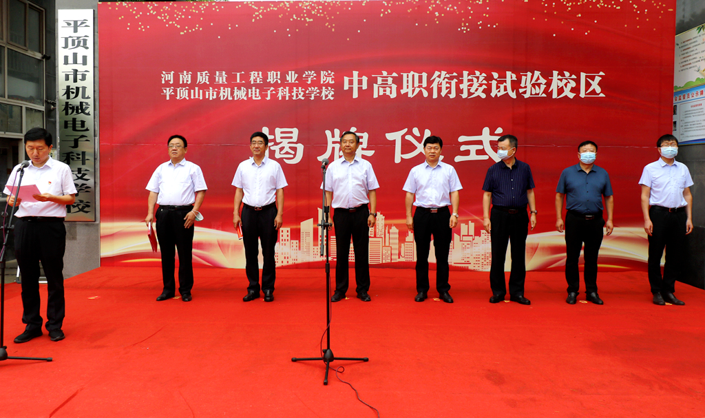 8月23上午,我院和平顶山市机械电子科技学校中高职衔接实验校区揭牌仪式在舞钢市举行。院长郑海金、常务副院长徐宗华、副院长田新现,舞钢市委书记刘文祥,舞钢市委副书记、市长朱志骞,平顶山市教体局副局长郭志勇出席仪式。舞钢市委副书记孟宪强主持仪式。